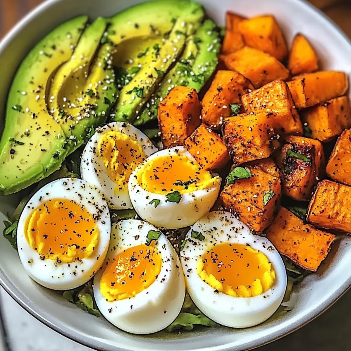 - Assemble the bowl starting with warm sweet potatoes, then layer on avocado slices and halved boiled eggs.
