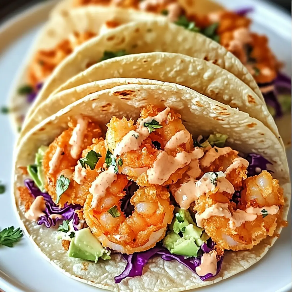 - To assemble, take a tortilla, add shredded cabbage, crispy shrimp, drizzle with bang bang sauce, and avocado if desired.