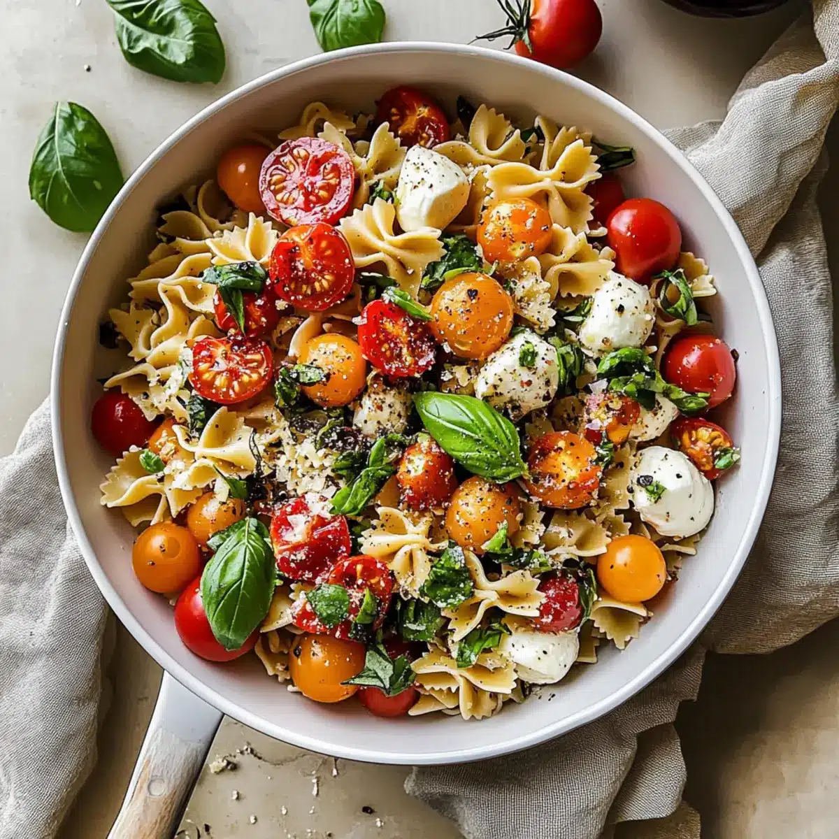 Definitely! This Bruschetta Pasta Salad is naturally vegetarian. If you’re making it for guests, ask if anyone has allergies or aversions to ingredients like gluten or dairy. For a gluten-free option, make sure to use gluten-free pasta and bread. And for lactose intolerance, simply omit the bocconcini or switch to avocado for creaminess!