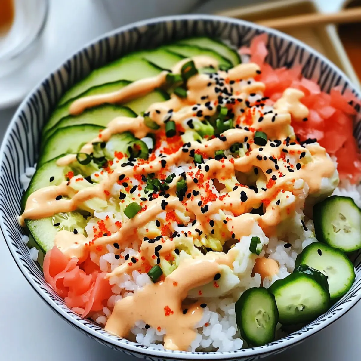 To enhance the flavors of your assembled bowls, create a simple drizzle. In a small bowl, combine soy sauce with sriracha (if desired) to taste. Carefully drizzle this sauce over each bowl, allowing its umami richness to infuse the fresh ingredients of your California Roll Sushi Bowls.