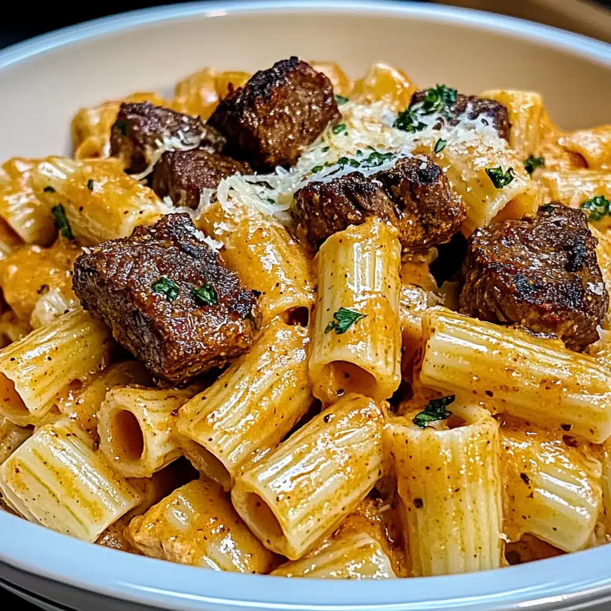 Cajun Steak Tips in Cheesy Rigatoni Parmesan Sauce Bliss