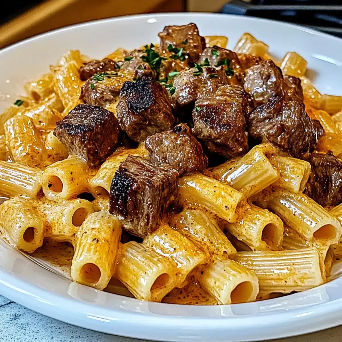 Cajun Steak Tips in Cheesy Rigatoni Parmesan Sauce Delight