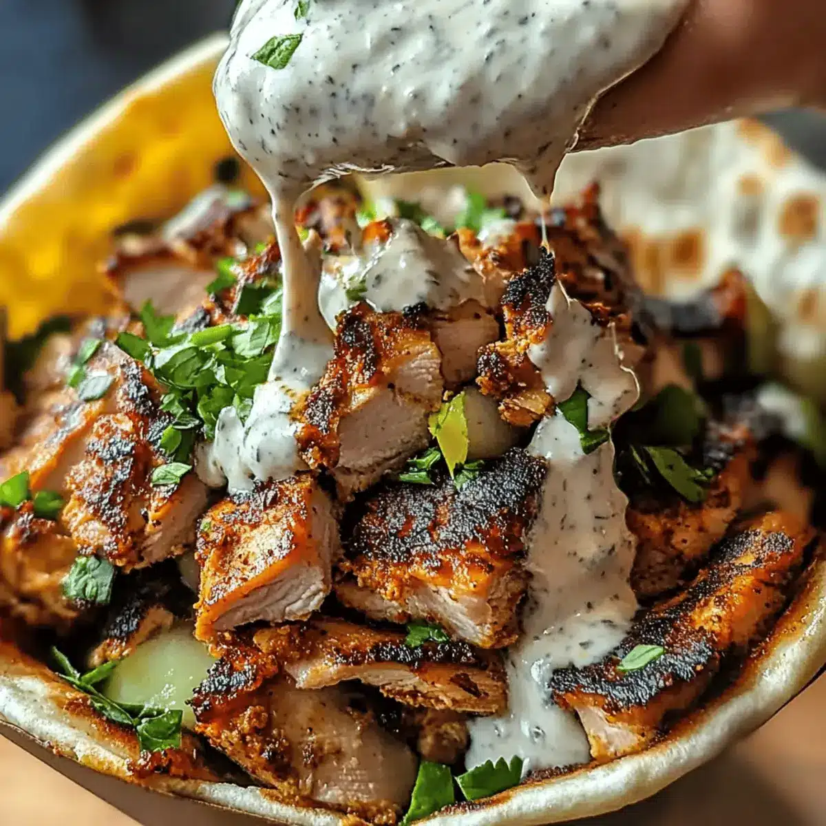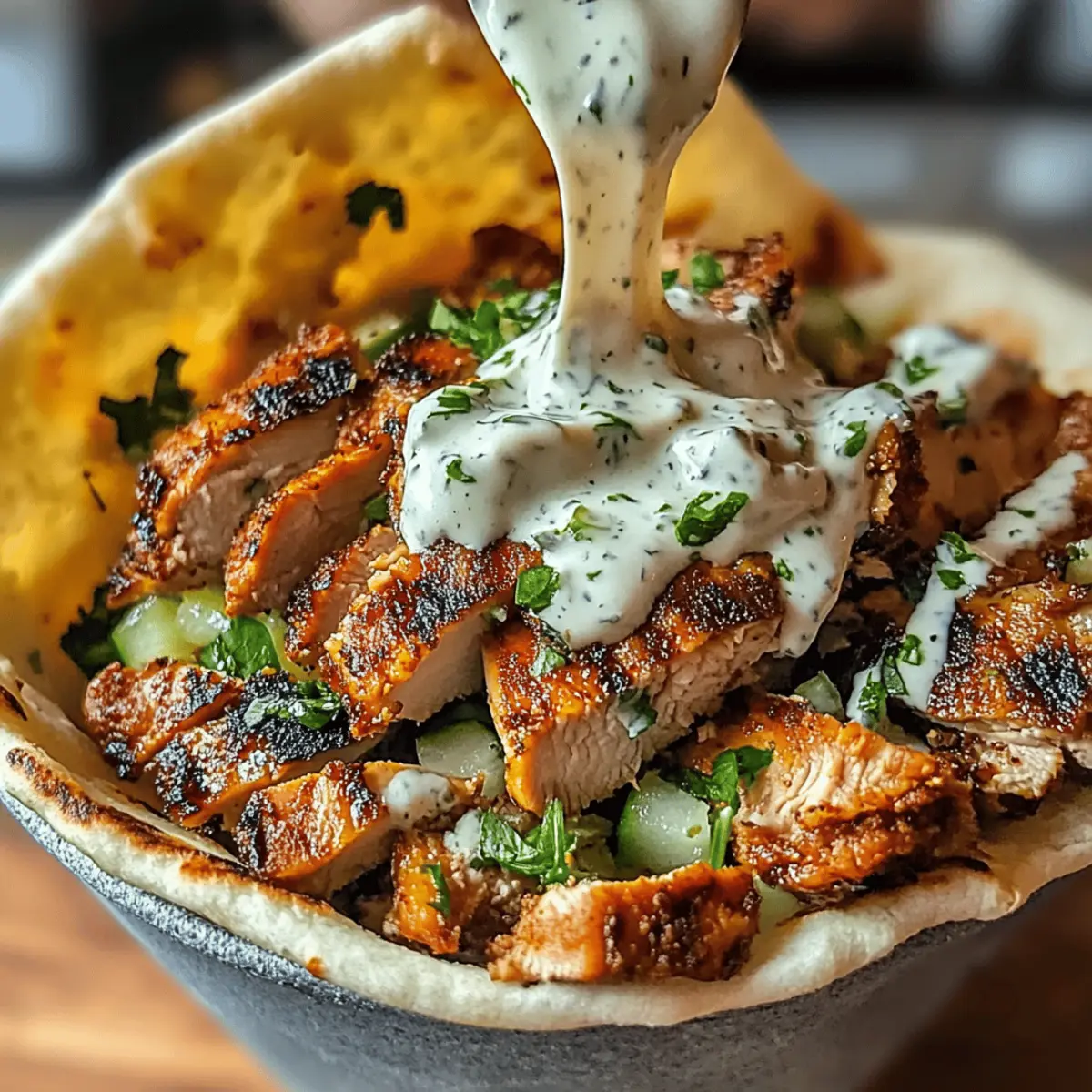 - Once the chicken is cooked, let it rest for 5 minutes, then slice into thin strips. Serve warm in pita bread or on a plate, drizzled with garlic sauce.