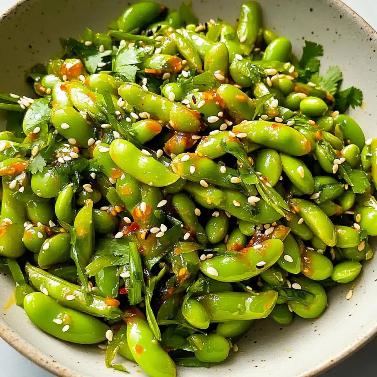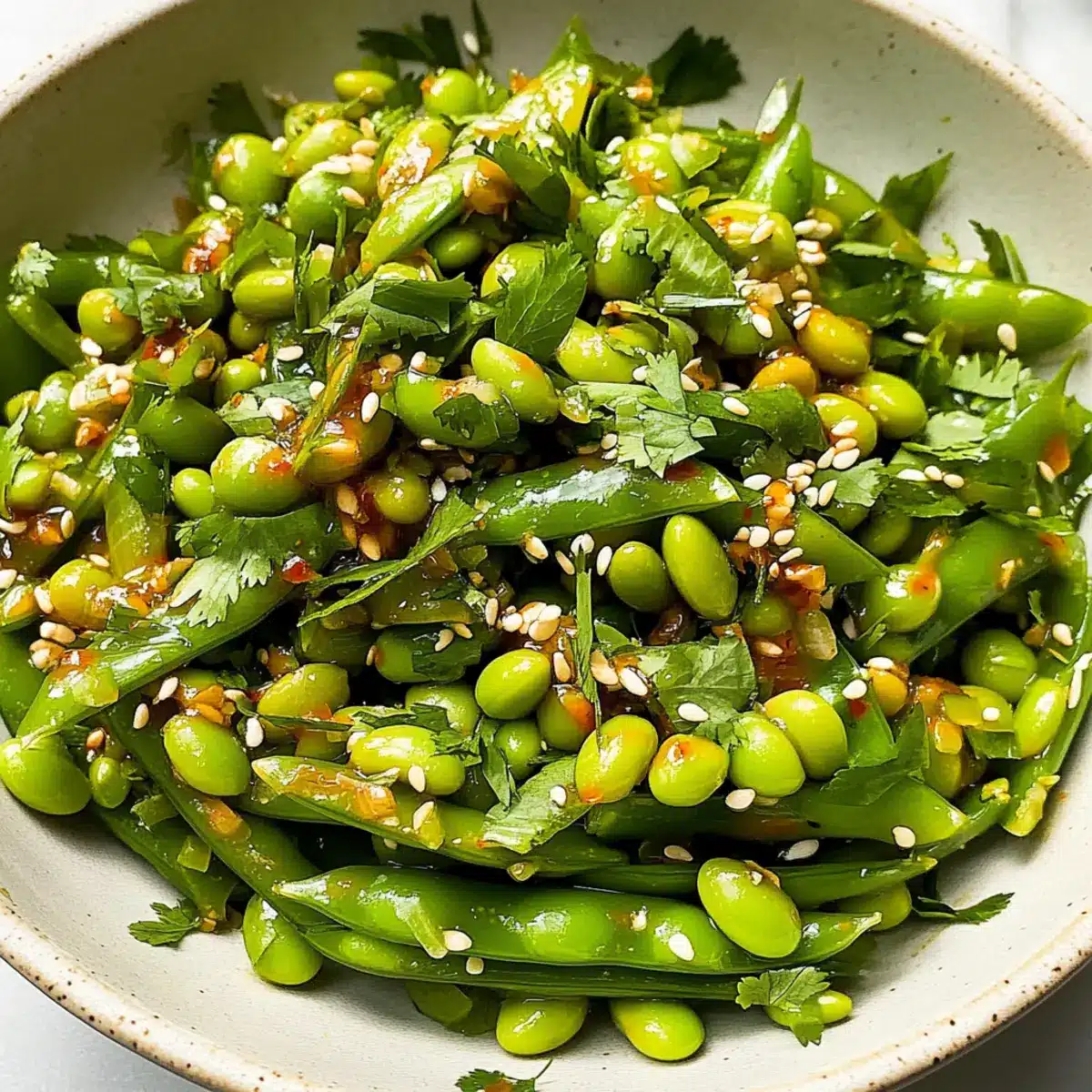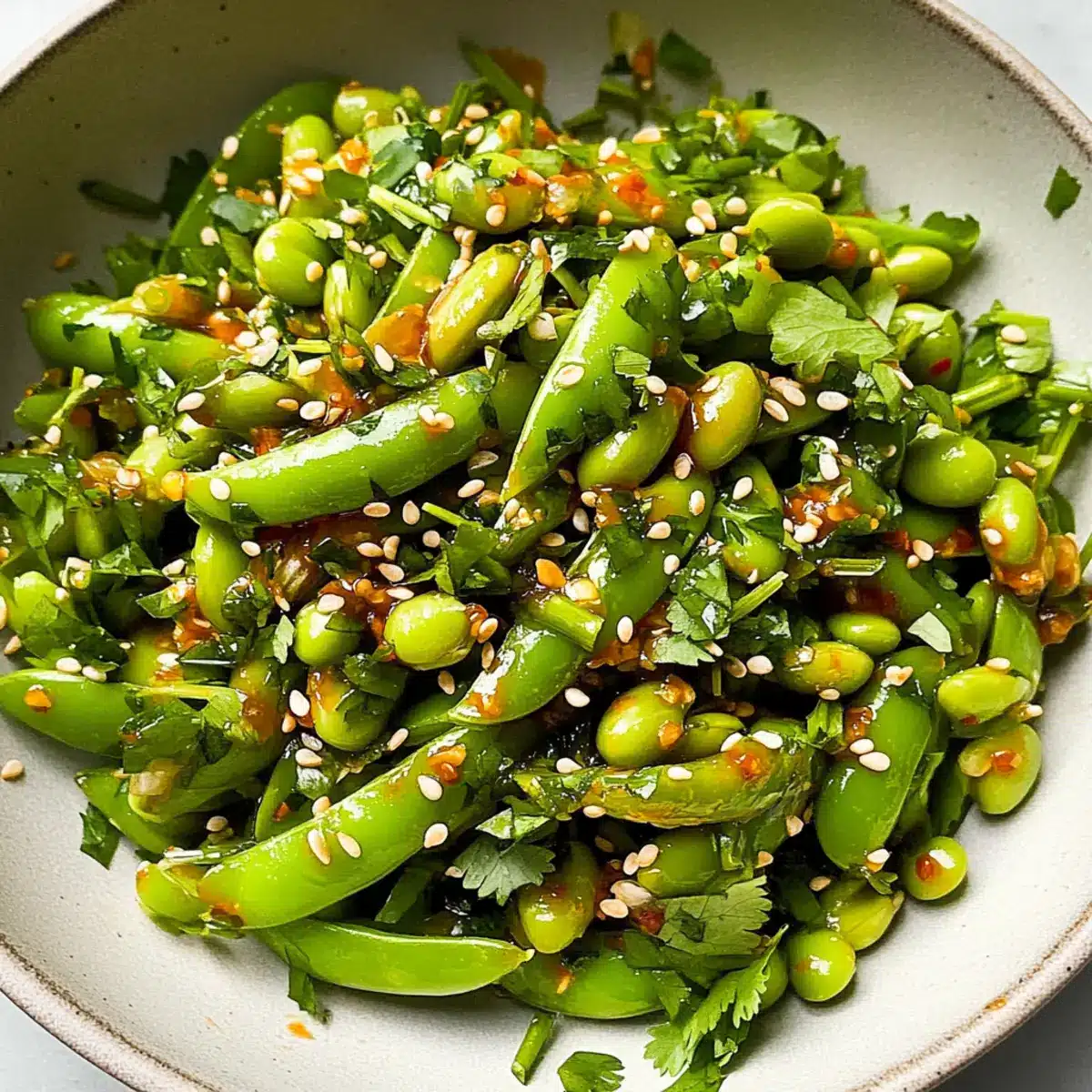 - While the edamame cools, take fresh snap peas and give them a thorough rinse. Thinly slice the snap peas at a diagonal for a striking presentation and added texture. In a large serving bowl, combine the sliced snap peas, blanched edamame, chopped scallions, and cilantro to create a colorful base for your Chili Crisp Snap Pea Salad.