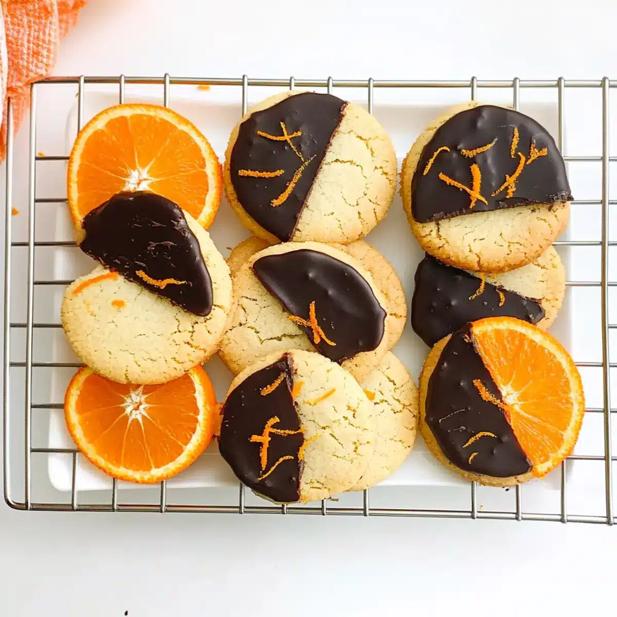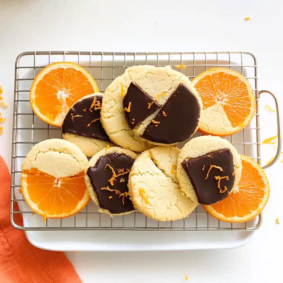 After baking, transfer the cookies to a wire rack and let them cool completely. Meanwhile, melt the dark or semi-sweet chocolate using a double boiler or in a microwave-safe bowl, stirring every 30 seconds. Once smooth and melted, dip each cooled cookie halfway into the chocolate, allowing the excess to drip off before setting them on parchment paper to harden. For an extra touch, sprinkle with a bit more orange zest.