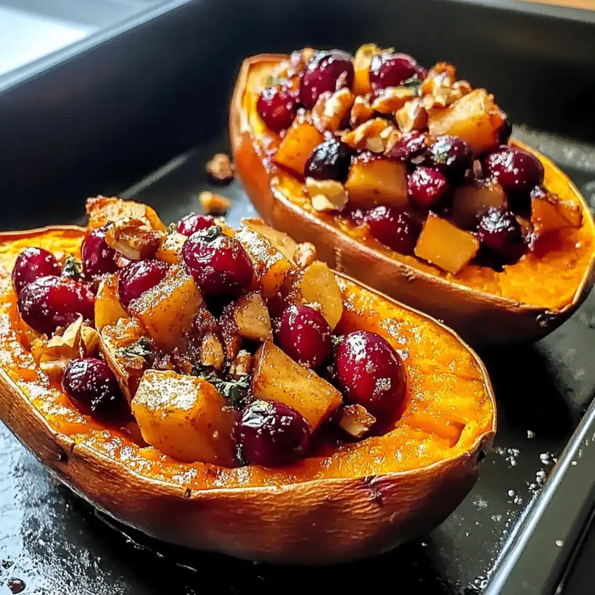 Once finished baking, carefully remove the sweet potatoes from the oven. Allow them to cool for a moment before serving. These Cranberry Apple Twice-Baked Sweet Potatoes not only make a stunning presentation but also offer a warm, comforting taste perfect for any fall gathering.