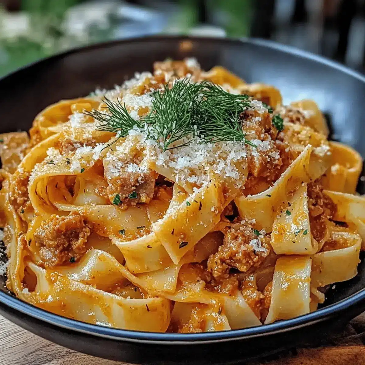 - Serve the pappardelle garnished with fresh basil or parsley. Enjoy while hot!