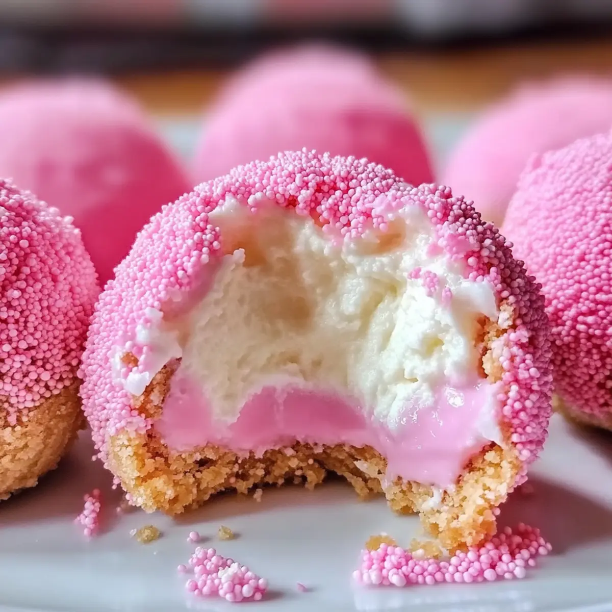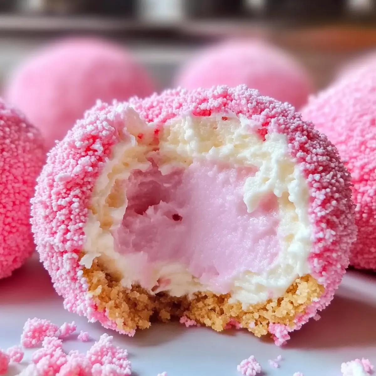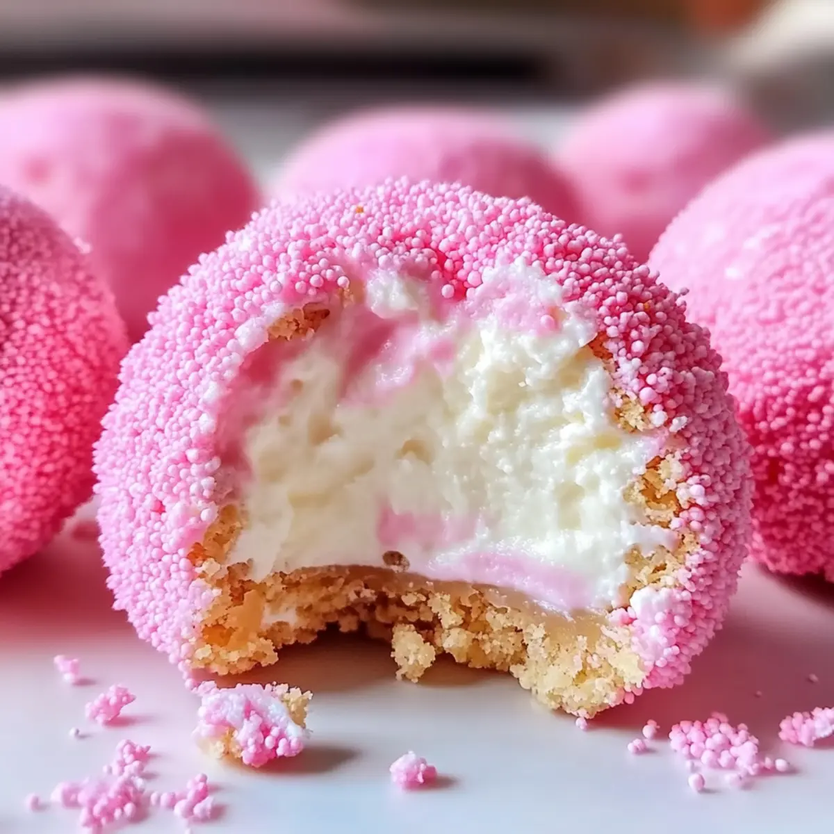 In a shallow dish, combine about 1 cup of cotton candy-flavored sugar with ¼ cup of crushed freeze-dried strawberries and optional pink sprinkles. Roll each cheesecake bomb in the mixture until thoroughly coated, ensuring it has an even, vibrant layer. This not only adds flavor but also gives the Crispy Cotton Candy Cheesecake Bombs their whimsical appearance.