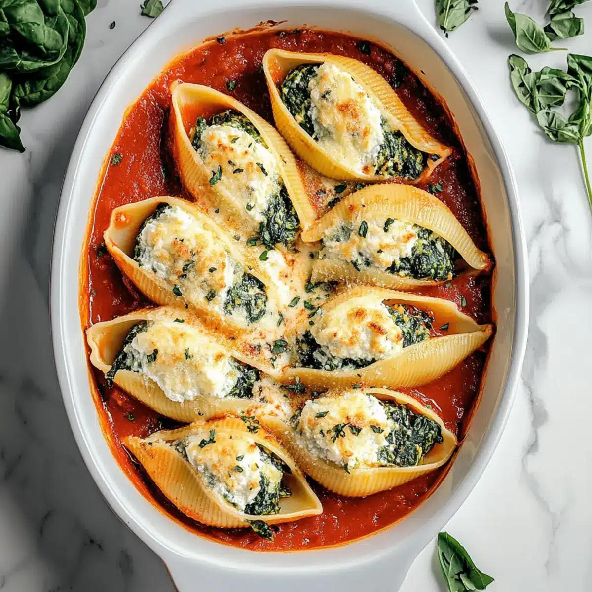 Gently take each cooked pasta shell and fill it with the creamy spinach and cheese mixture. Place the stuffed shells seam-side up in the baking dish, arranging them closely but not touching. As you work, admire the festive colors and textures – it’s all part of the holiday magic that makes this dish so special!