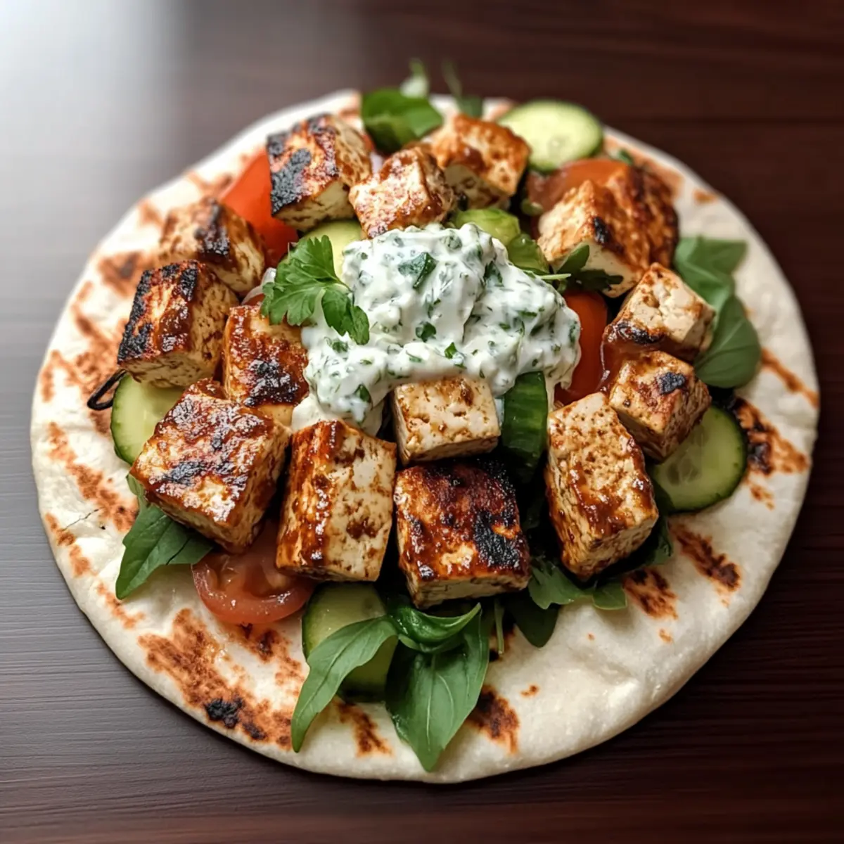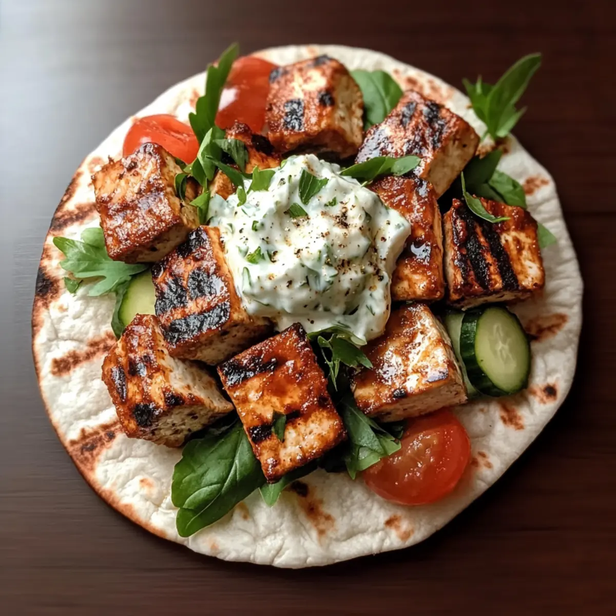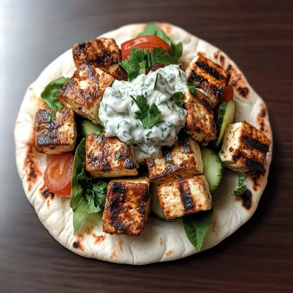 - Warm pita bread in a skillet and serve with marinated tofu skewers and Vegan Tzatziki.