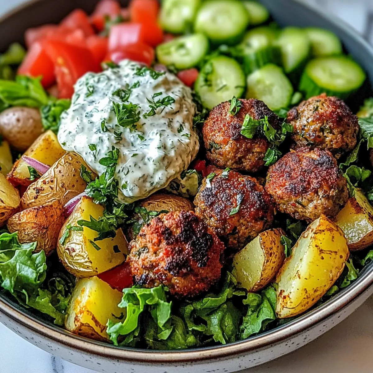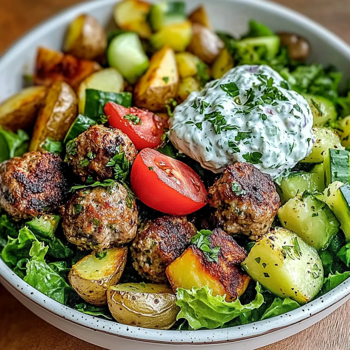 Start by placing the lettuce as the base in serving bowls. Layer on the chopped tomatoes, cucumbers, and red onion, followed by the crispy roasted potatoes and the cooked meatballs from your Greek Meatball Bowl. Finally, add a generous dollop of tzatziki sauce on top and sprinkle with additional herbs if desired for a colorful and delicious presentation.