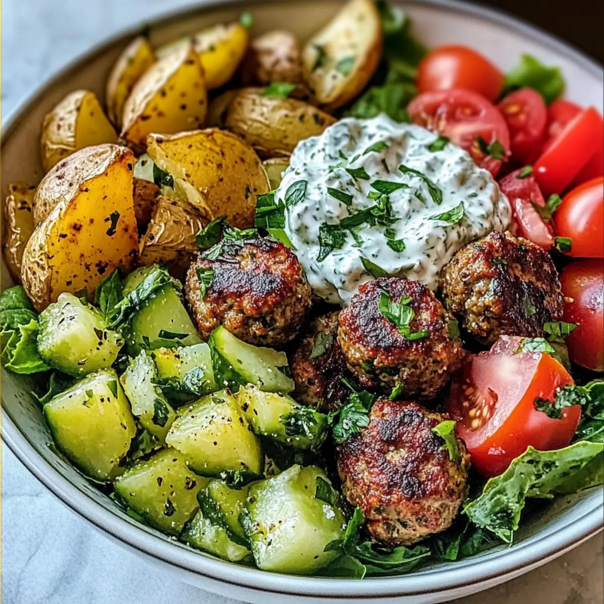 - Assemble the bowl by placing lettuce as the base, layering on the chopped tomatoes, cucumbers, red onion, roasted potatoes, and meatballs. Add tzatziki sauce on top.