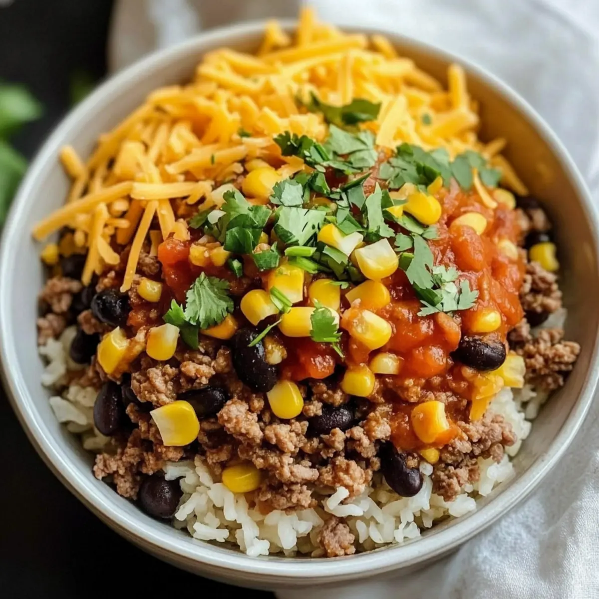 To create your Ground Beef Burrito Bowl, spoon a generous portion of hot rice into each bowl. Layer on the seasoned beef, followed by the black beans and corn. Finish each bowl with a shower of shredded cheddar cheese, which will melt beautifully from the warmth of the ingredients.