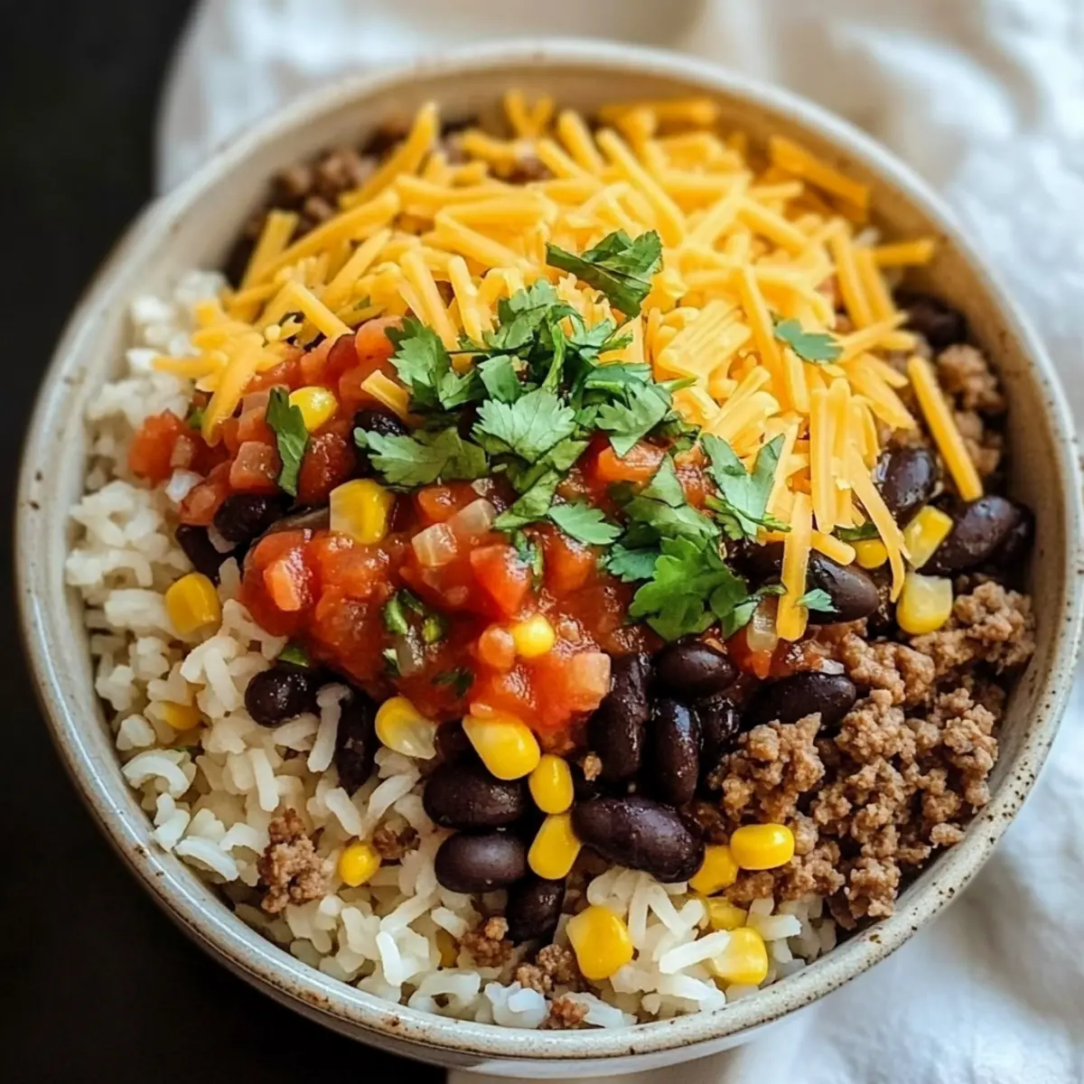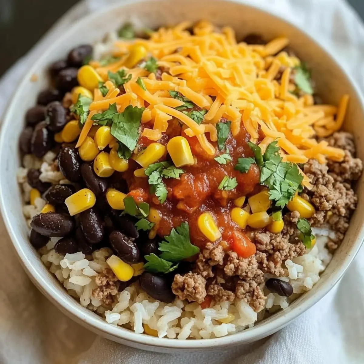 - Assemble bowls by layering hot rice, seasoned beef, black beans, and corn. Top with cheddar cheese.