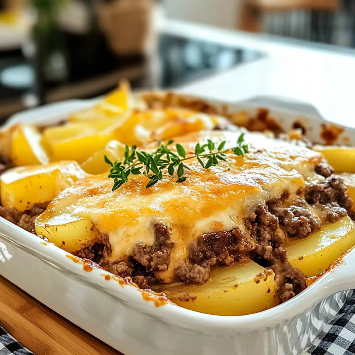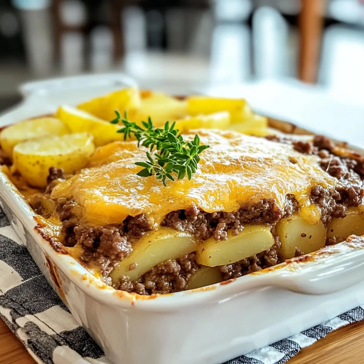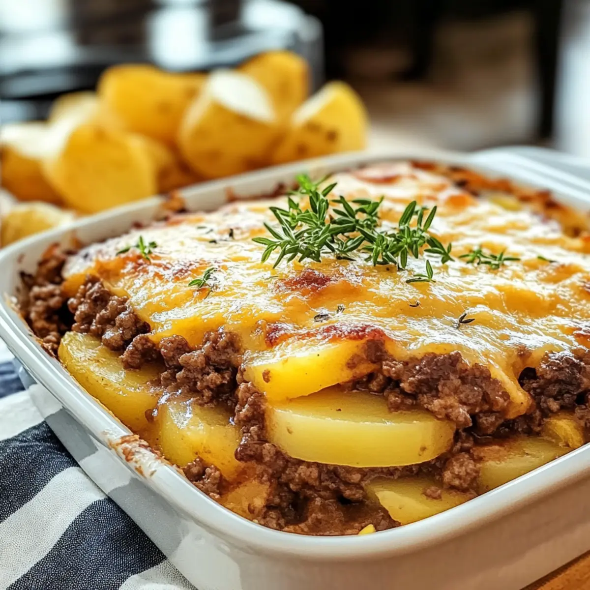 - Layer half of the seasoned potato slices, half of the beef mixture, and half of the shredded cheddar cheese in a deep baking dish.