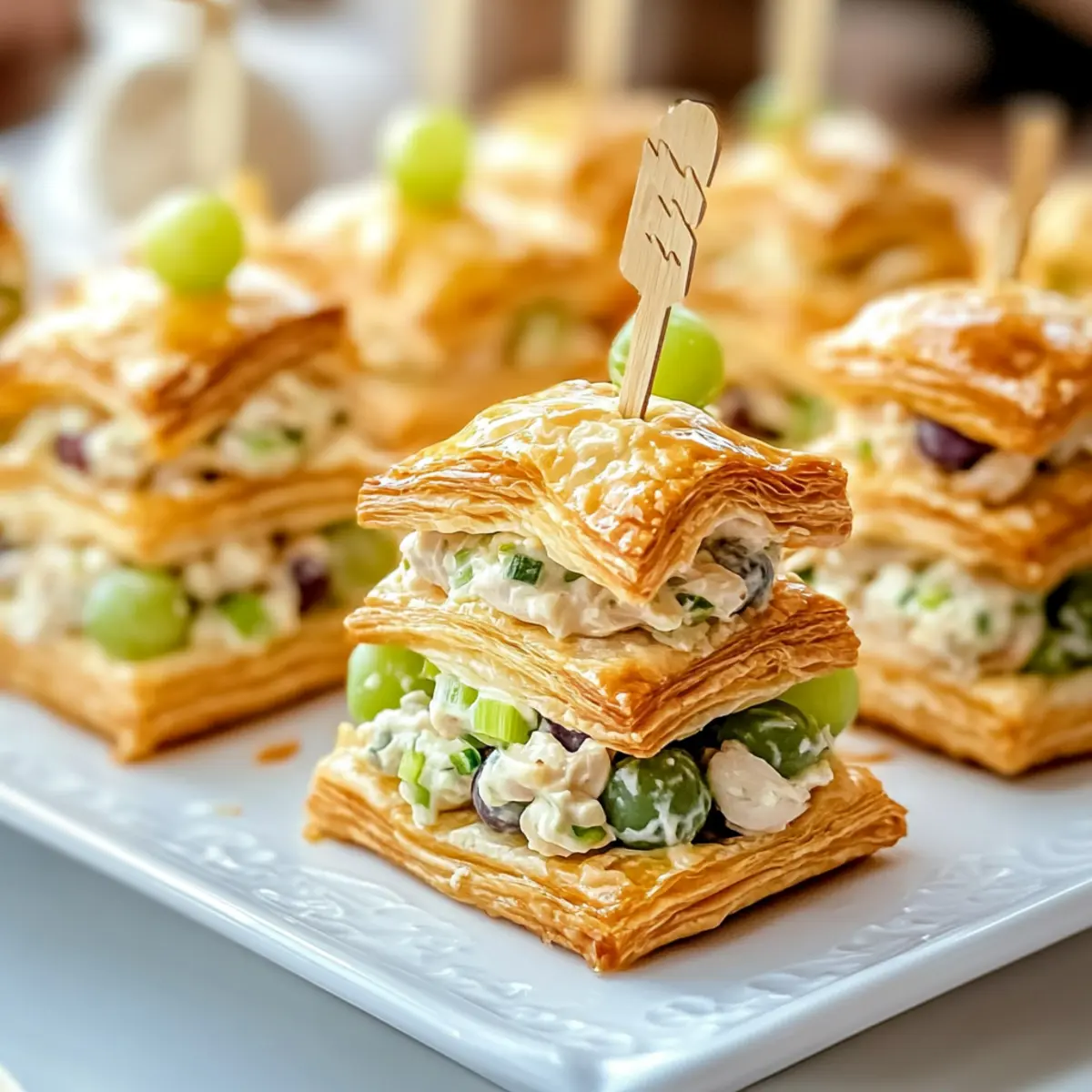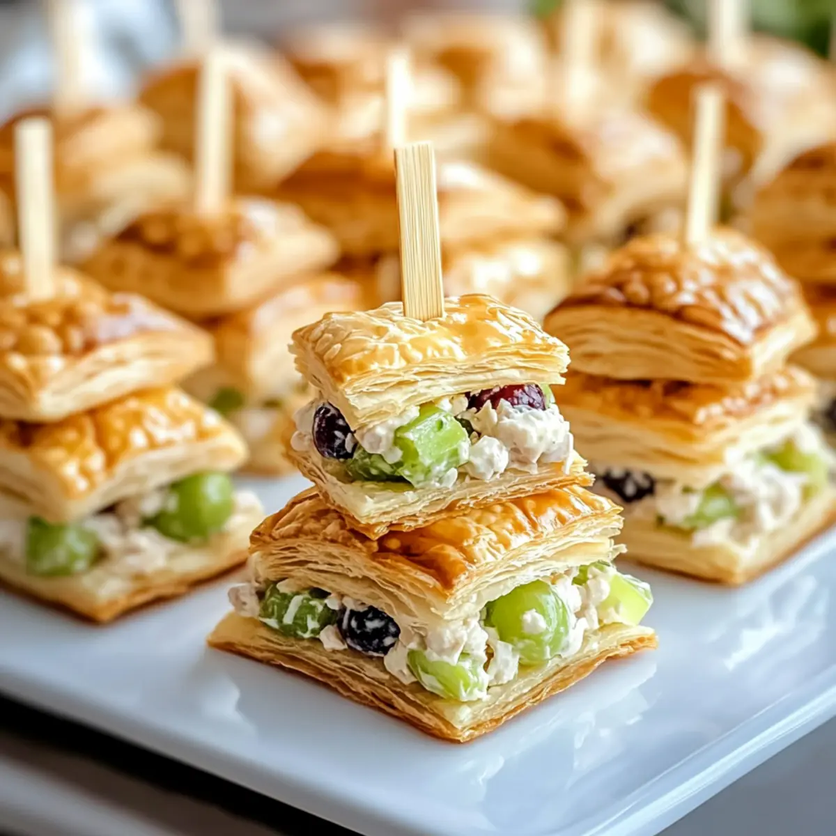 - Take bottom halves of the puff pastries, spoon in 2-3 tablespoons of chicken salad, and place the top halves gently.