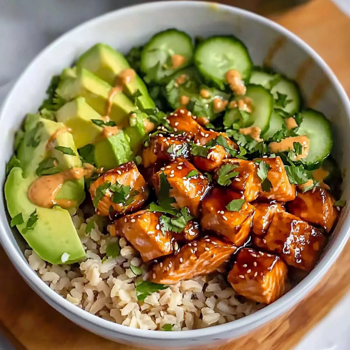 To bring your Honey Glazed Salmon Bowl together, start by placing a generous scoop of cooked brown rice in each serving bowl. Next, layer on the freshly roasted salmon cubes, followed by the vibrant cucumber mixture. Drizzle the creamy paprika mayo sauce over the top, completing your wholesome bowl with an explosion of flavors and textures that promises to delight!