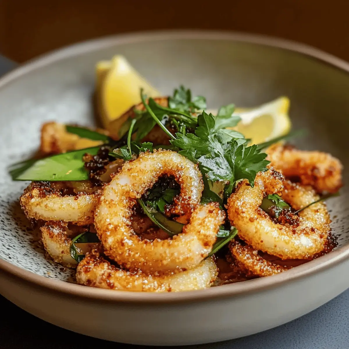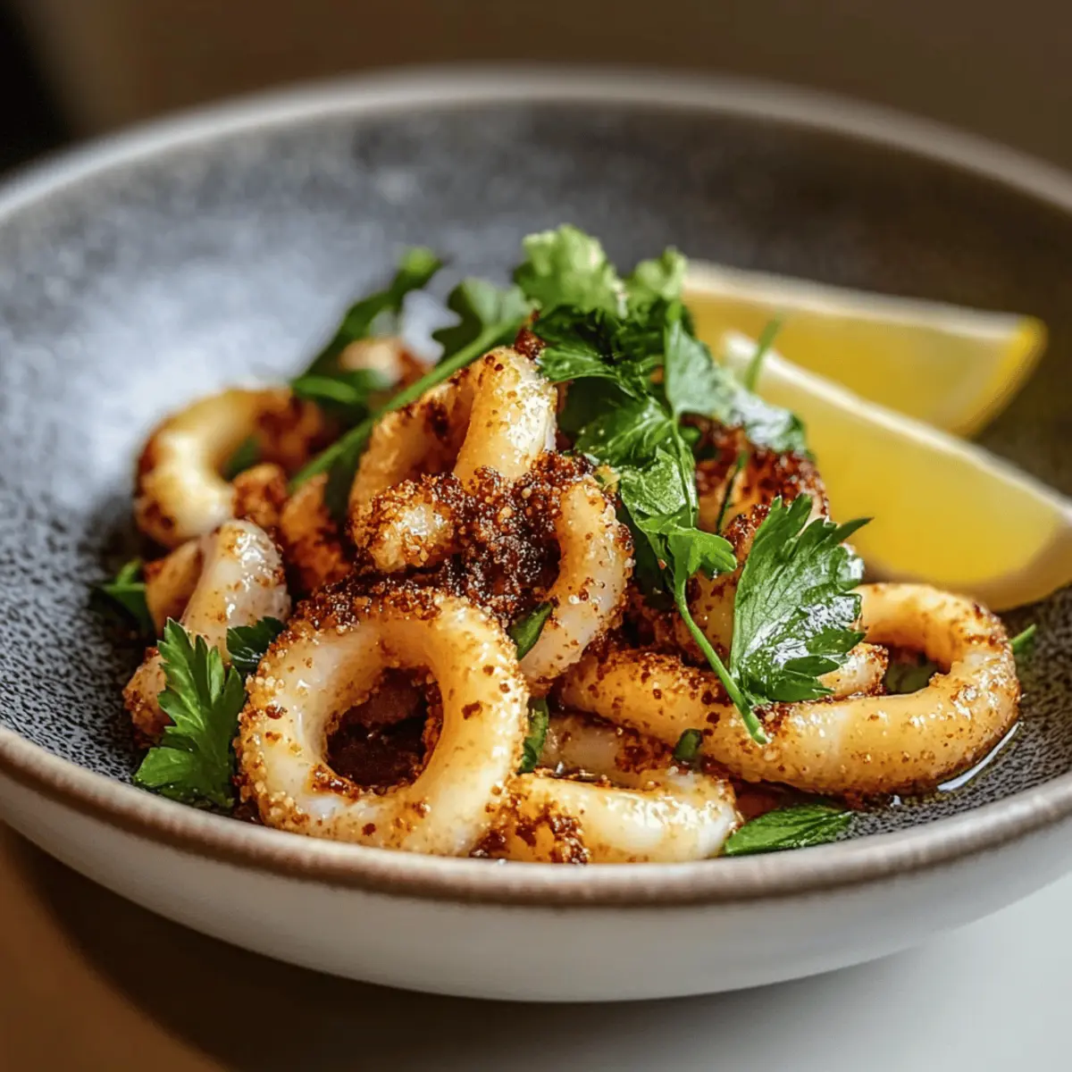 - Plate the calamari in a bowl, garnish with parsley or cilantro, and arrange lemon wedges around.