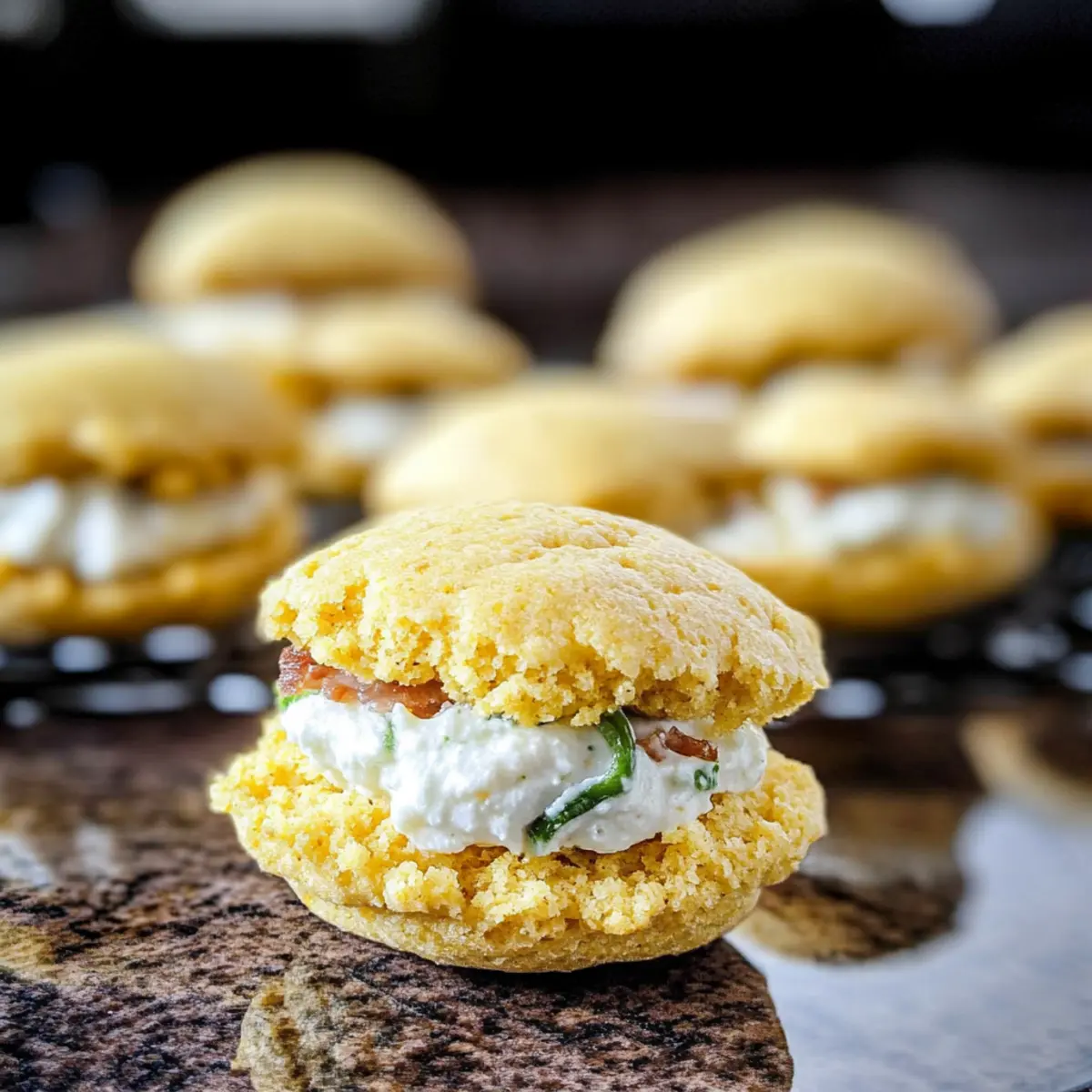 Once the cornbread rounds are completely cooled, take half of them and spread or pipe about 1 tablespoon of the creamy bacon goat cheese filling onto the flat side. Place the other half of the cornbread rounds on top to create sandwiches. Press gently to allow the filling to spread slightly, finishing off your savory Jalapeno Cornbread Whoopie Pies with Bacon Goat Cheese as a delightful appetizer, perfect for sharing.
