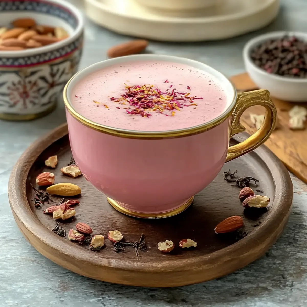 Enhance your Kashmiri Pink Chai by garnishing each cup with a sprinkle of crushed nuts, such as pistachios or almonds, and a few saffron strands for elegance. Optionally, add a few rose petals for a delightful floral touch. Serve hot, allowing your guests to bask in the warm, aromatic experience that is truly special and inviting.
