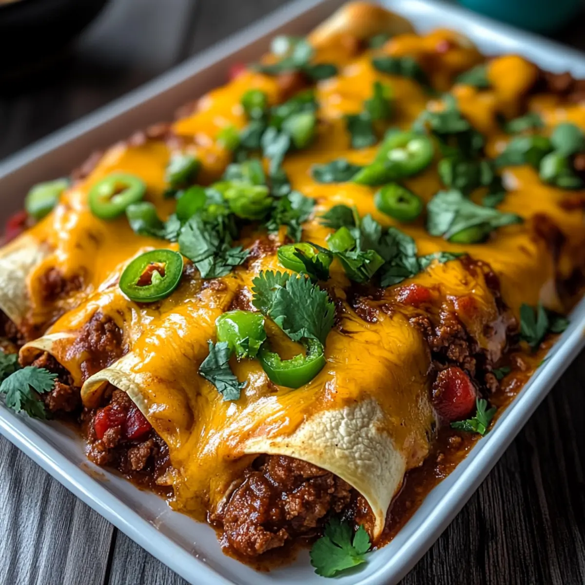 - Layer the remaining beef mixture on top of the enchiladas and sprinkle with remaining shredded cheese.