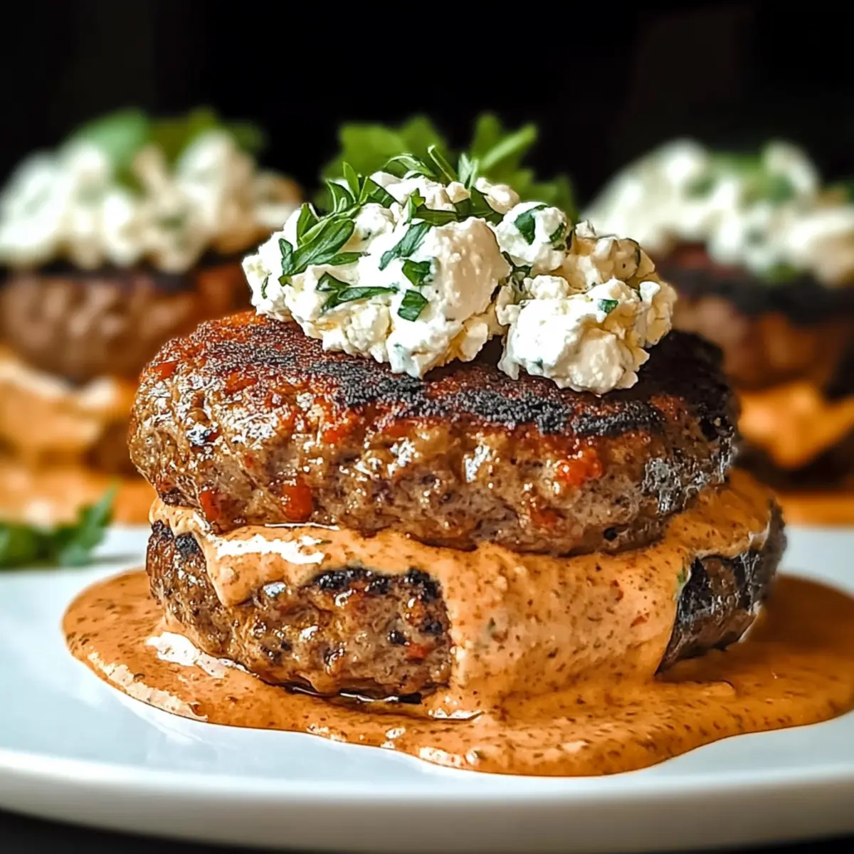- Plate the burgers with the sauce drizzled on top, garnished with parsley and additional feta crumbles if desired.