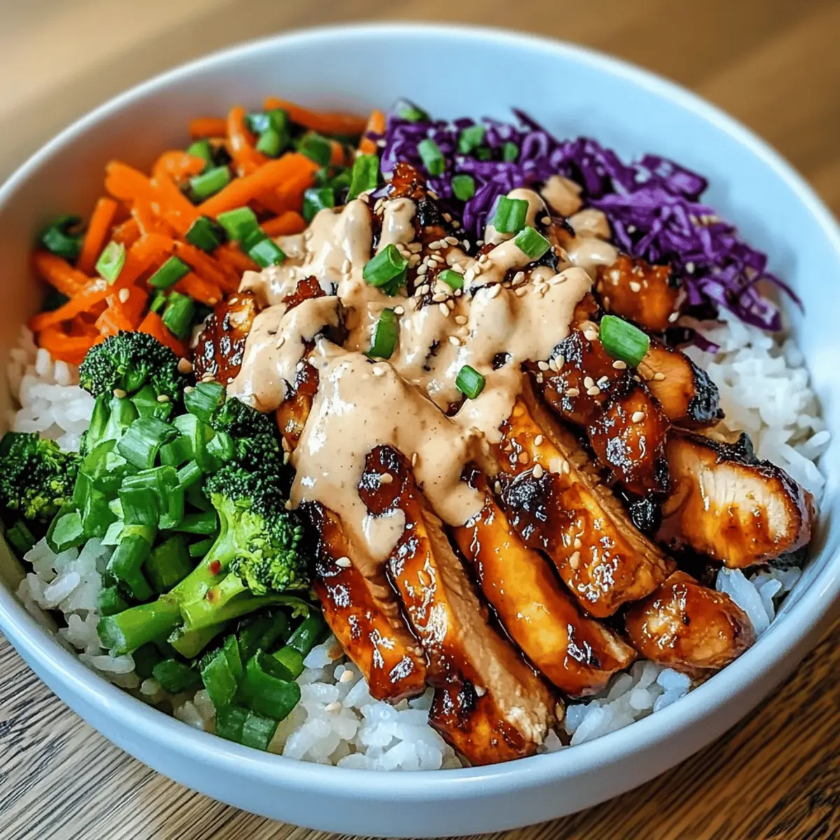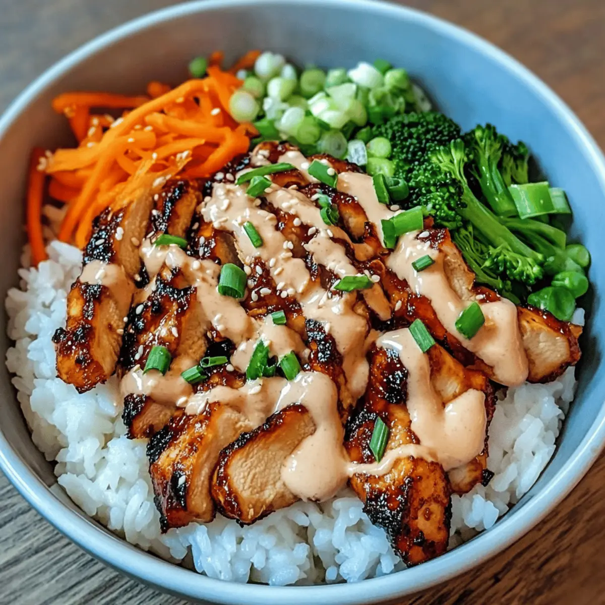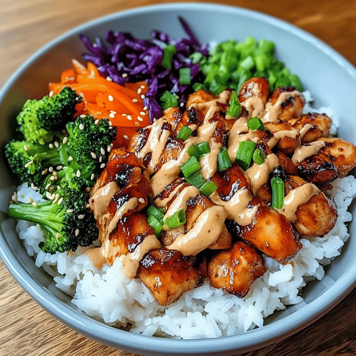 - Assemble your bowls by starting with a generous serving of rice as the base. Evenly distribute the cooked chicken and stir-fried vegetables over the rice, drizzle the prepared Gochujang cream sauce on top, and garnish with sliced green onions and sesame seeds.