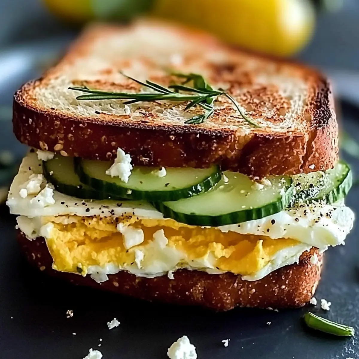 Once the bread is toasted and the eggs are cooked, it’s time to build your sandwich. Start with one slice of toasted bread as your base, and layer on the tomatoes and cucumbers evenly. Next, carefully place the fluffy omelet on top, followed by a generous sprinkle of crumbled feta cheese for added creaminess.