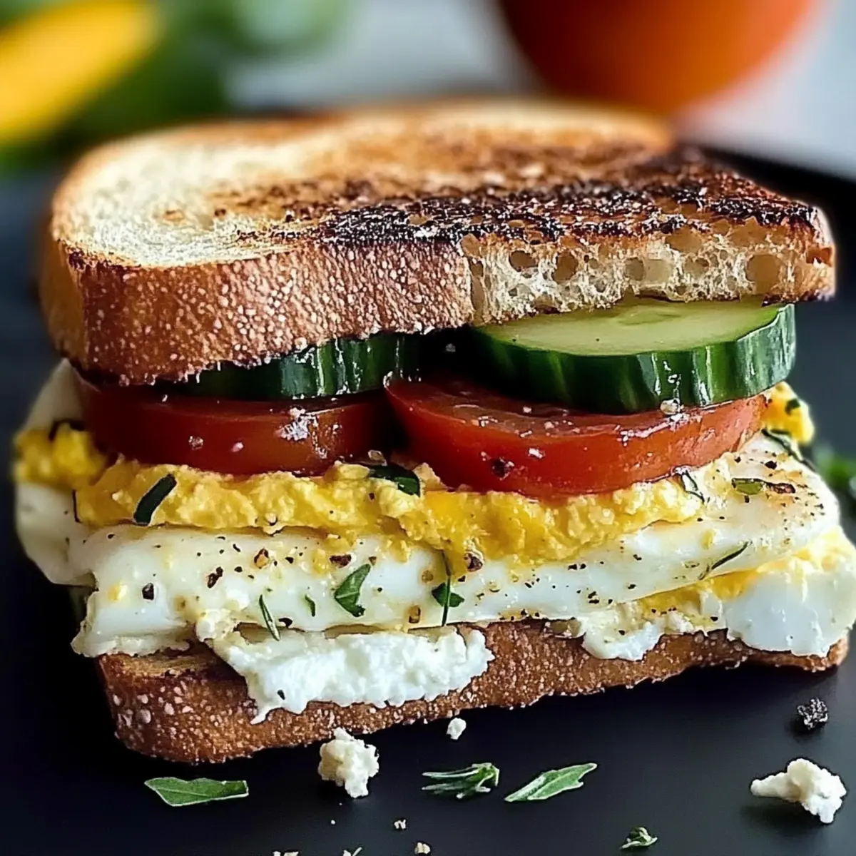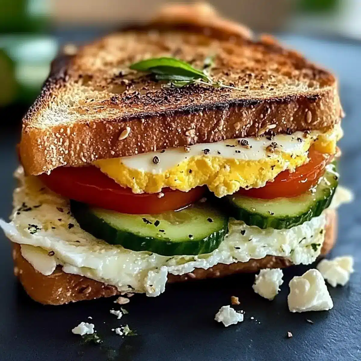- Assemble the sandwich by layering toasted bread, tomatoes, cucumbers, the omelet, and feta cheese.