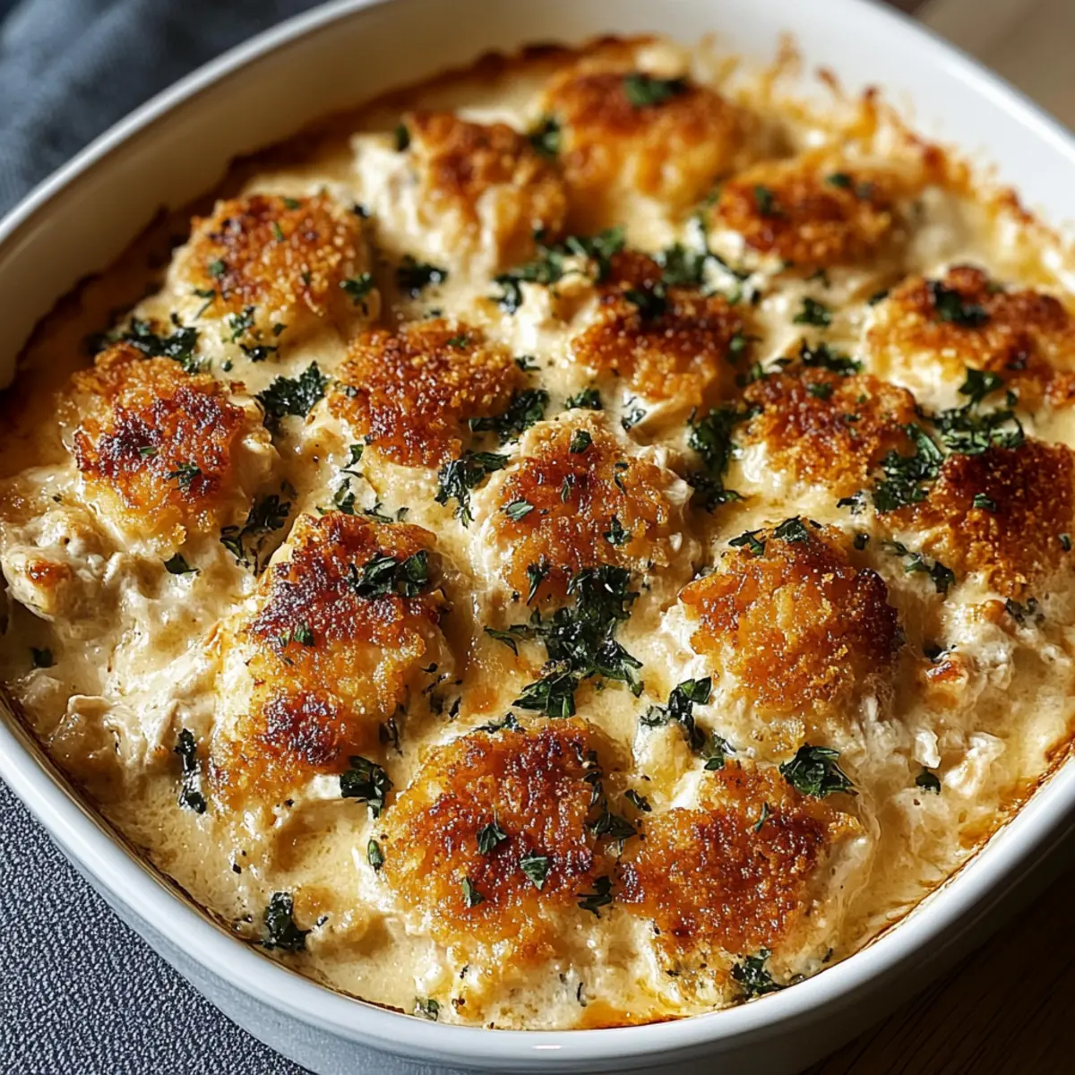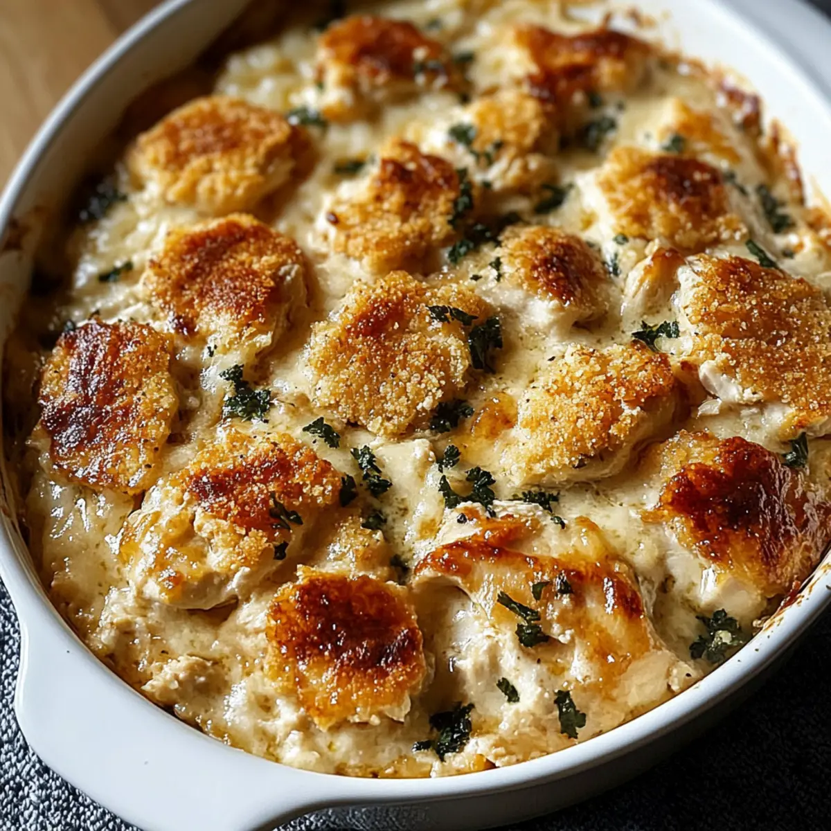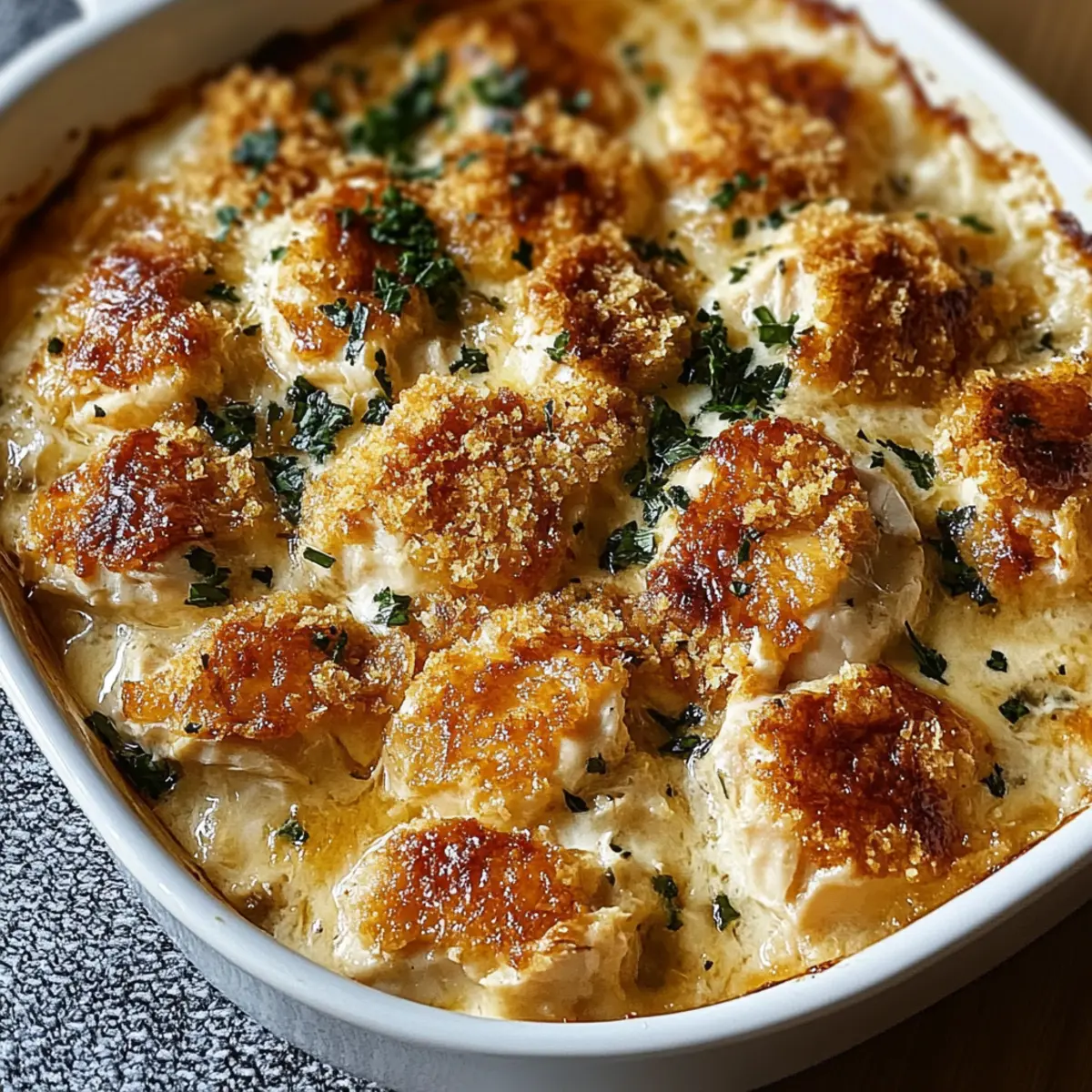 Once baked, remove the casserole from the oven and allow it to cool for about 5-10 minutes before serving. This resting time helps the flavors meld together while avoiding any burnt tongues. Cut into squares, serve hot, and watch your guests delight in each comforting bite of this creamy chicken goodness!