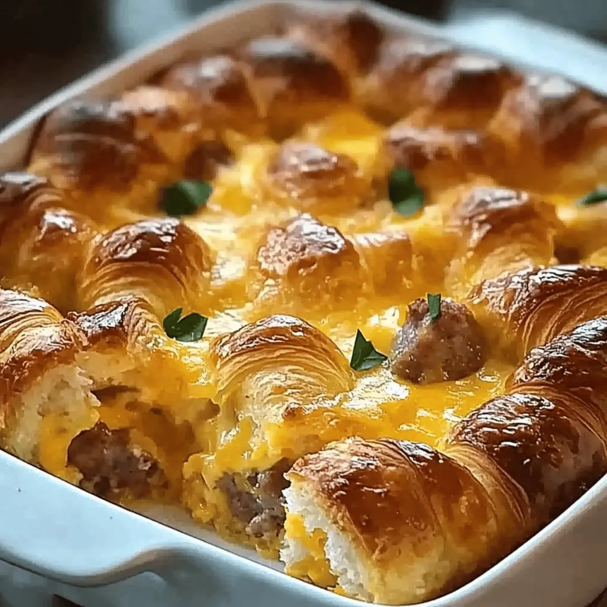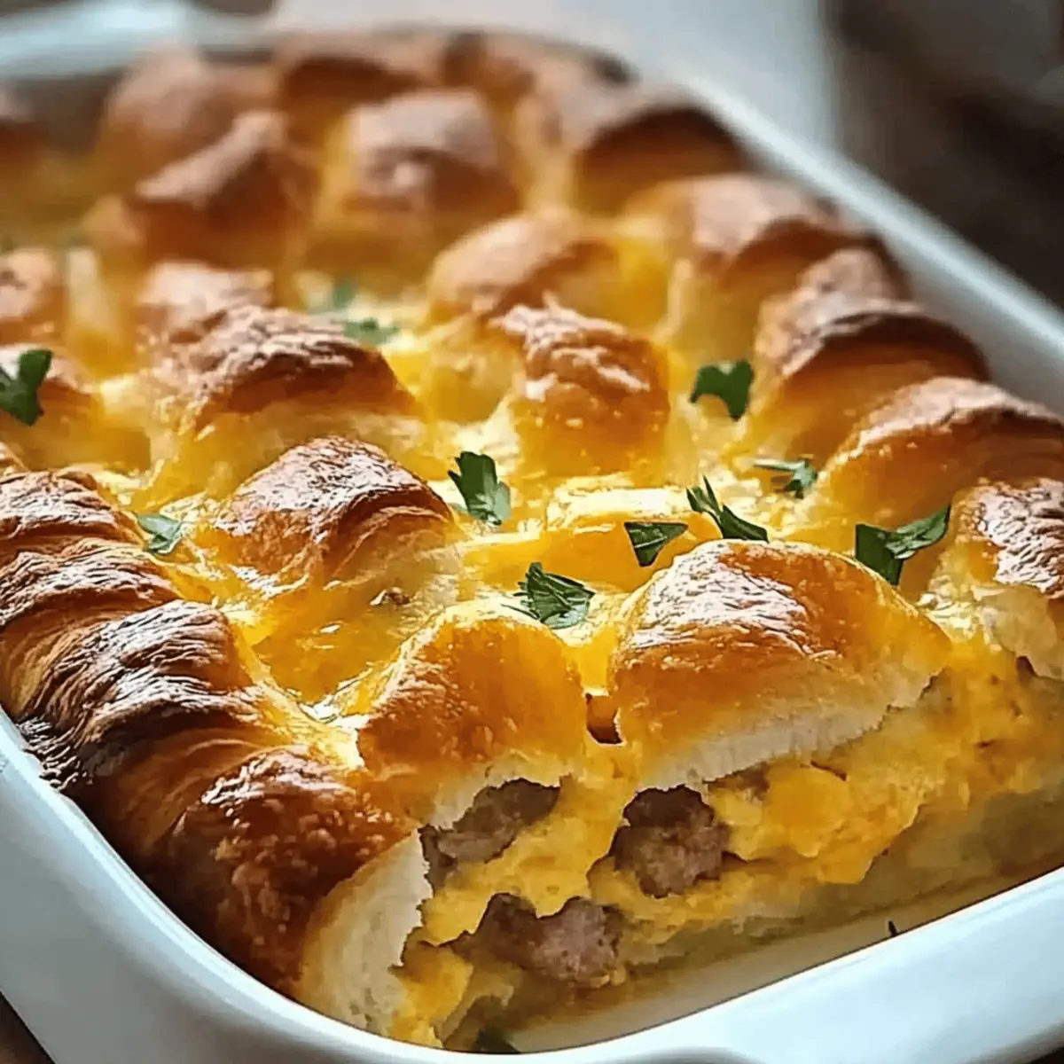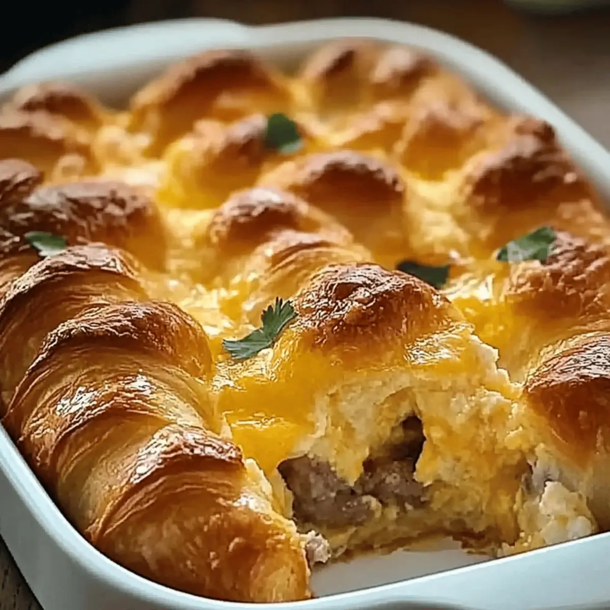 As I stumbled into my kitchen one hectic morning, the aroma of freshly baked croissants lingered, reminding me of cozy weekends spent enjoying leisurely breakfasts. This moment sparked the idea for my Overnight Croissant Breakfast Casserole, a dish that perfectly melds flakiness with savory goodness. Ideal for busy weekdays or festive brunches, this make-ahead recipe not only simplifies your morning routine but also guarantees a delightful start to the day. Imagine popping this casserole into the oven while you pour yourself a cup of coffee—minimal effort, maximum flavor! With its crowd-pleasing appeal and the ability to customize with your favorite sausage or cheese, you’ll find yourself craving it again and again. What variations will you come up with for your own twist?