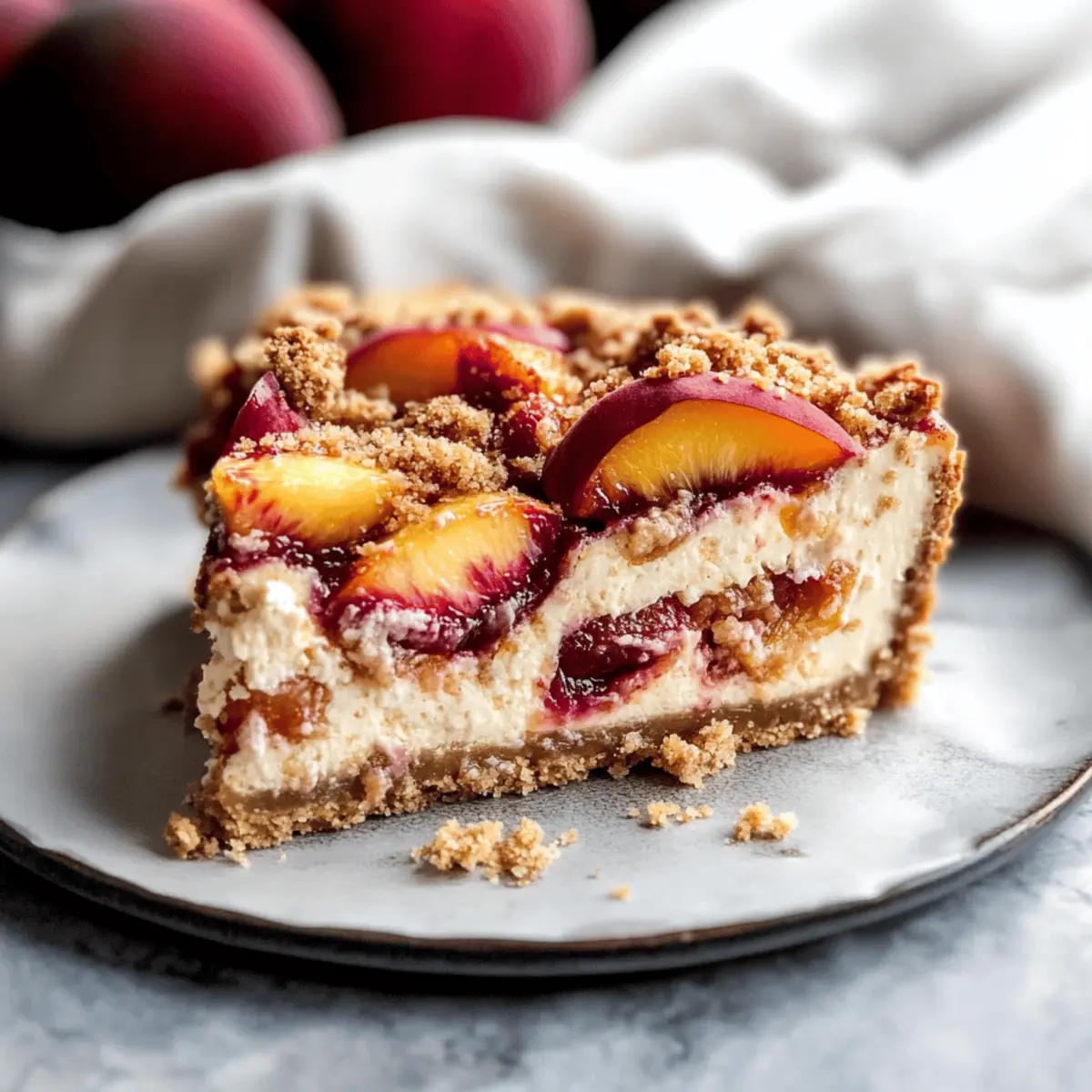 - Pour half of the cheesecake batter into the crust, layer with peaches and streusel, then add remaining batter. Bake at 325°F (160°C) for 55–60 minutes.
