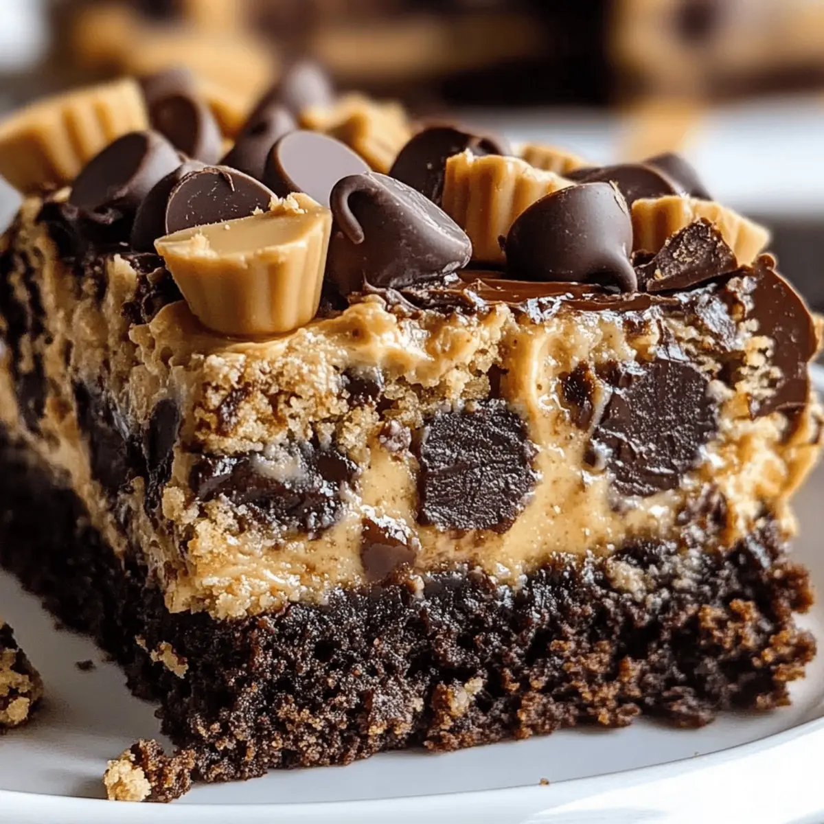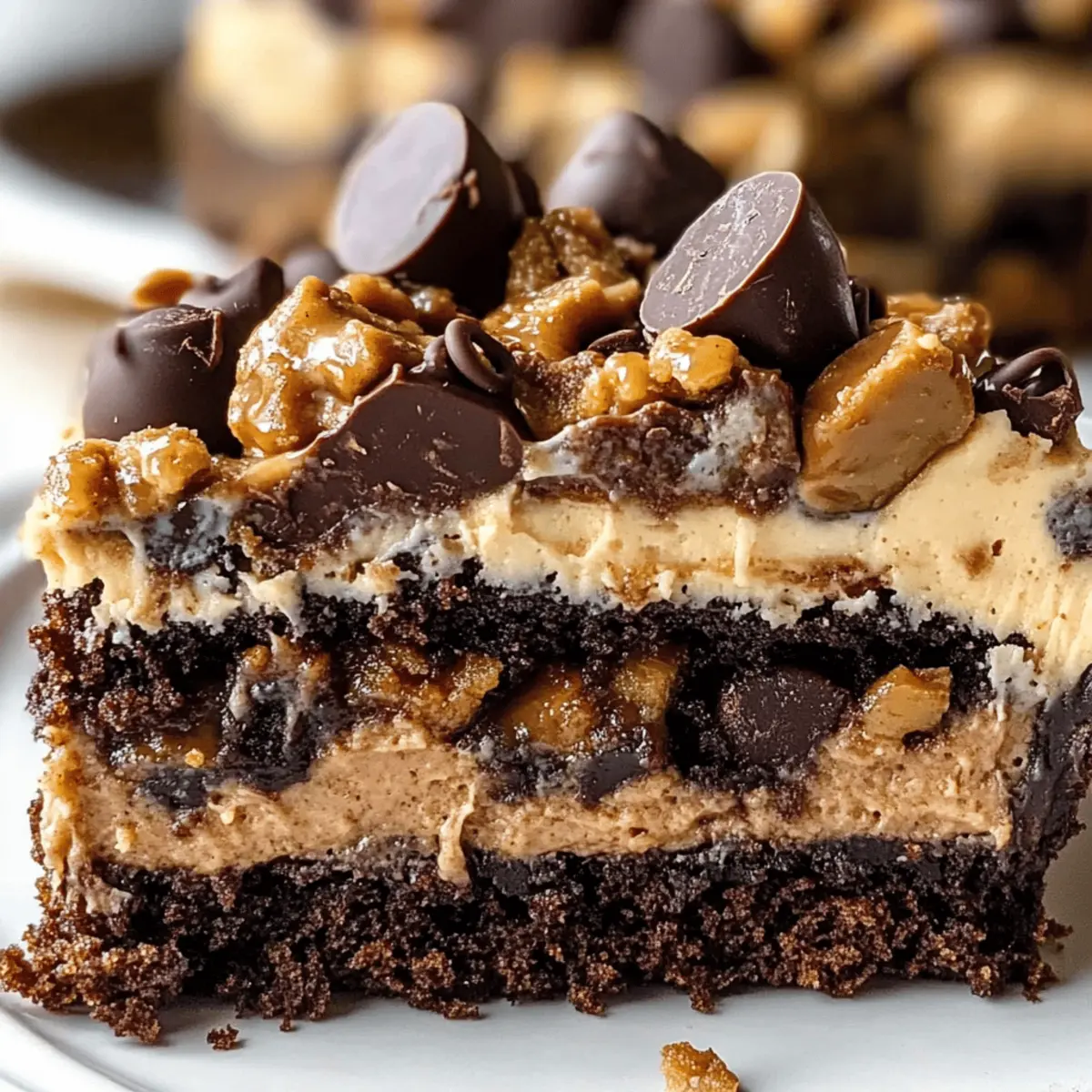 - Sprinkle half of the chopped peanut butter cups evenly over the peanut butter layer.