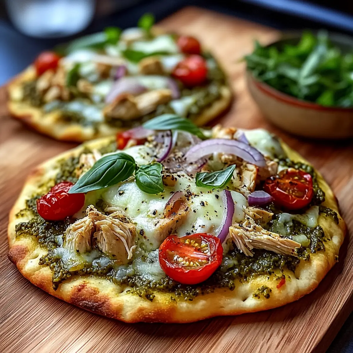 Reheating: To bring your Pesto Chicken Flatbread back to life, reheat in an oven at 350°F (180°C) for 5–6 minutes or use an air fryer for about 2–3 minutes until heated through.