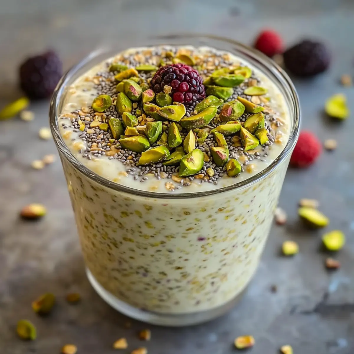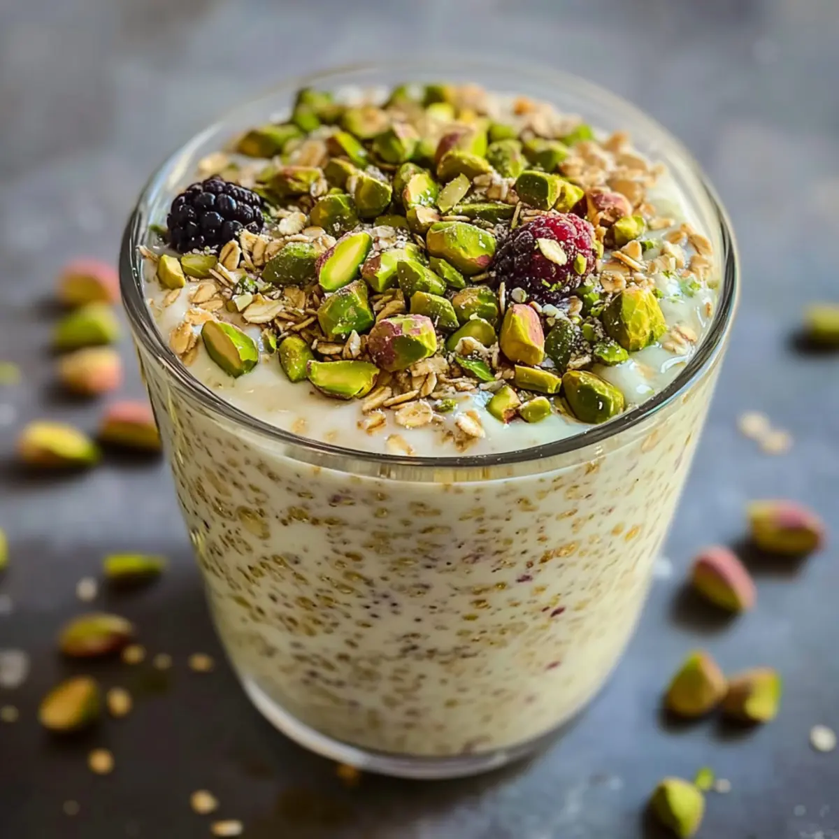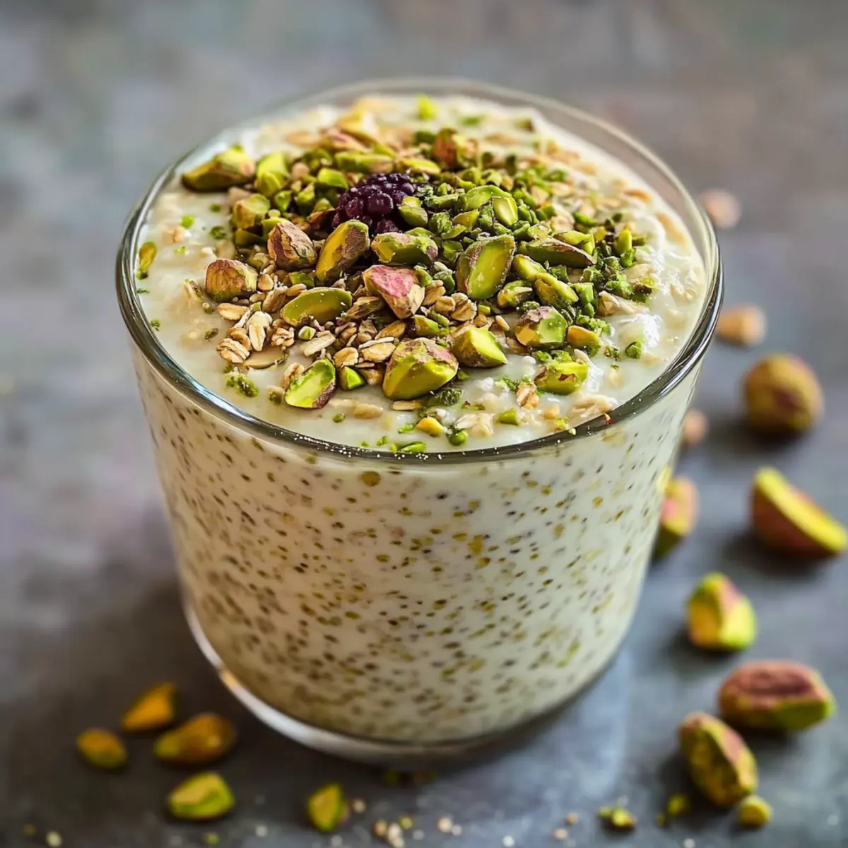 In a medium-sized bowl or jar, mix together 1 cup of rolled oats, 1 cup of your preferred milk (dairy or plant-based), and ½ cup of Greek yogurt until everything is well blended. Add ¼ cup of chopped shelled pistachios, 1 tablespoon of chia seeds for thickness, 1 tablespoon of honey or maple syrup for sweetness, and a splash of vanilla extract. Stir until the mixture is cohesive and creamy.