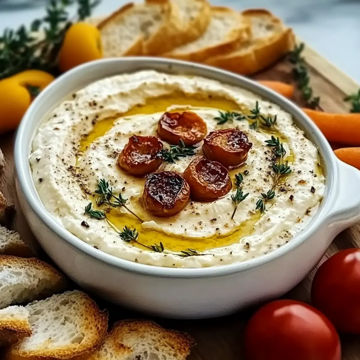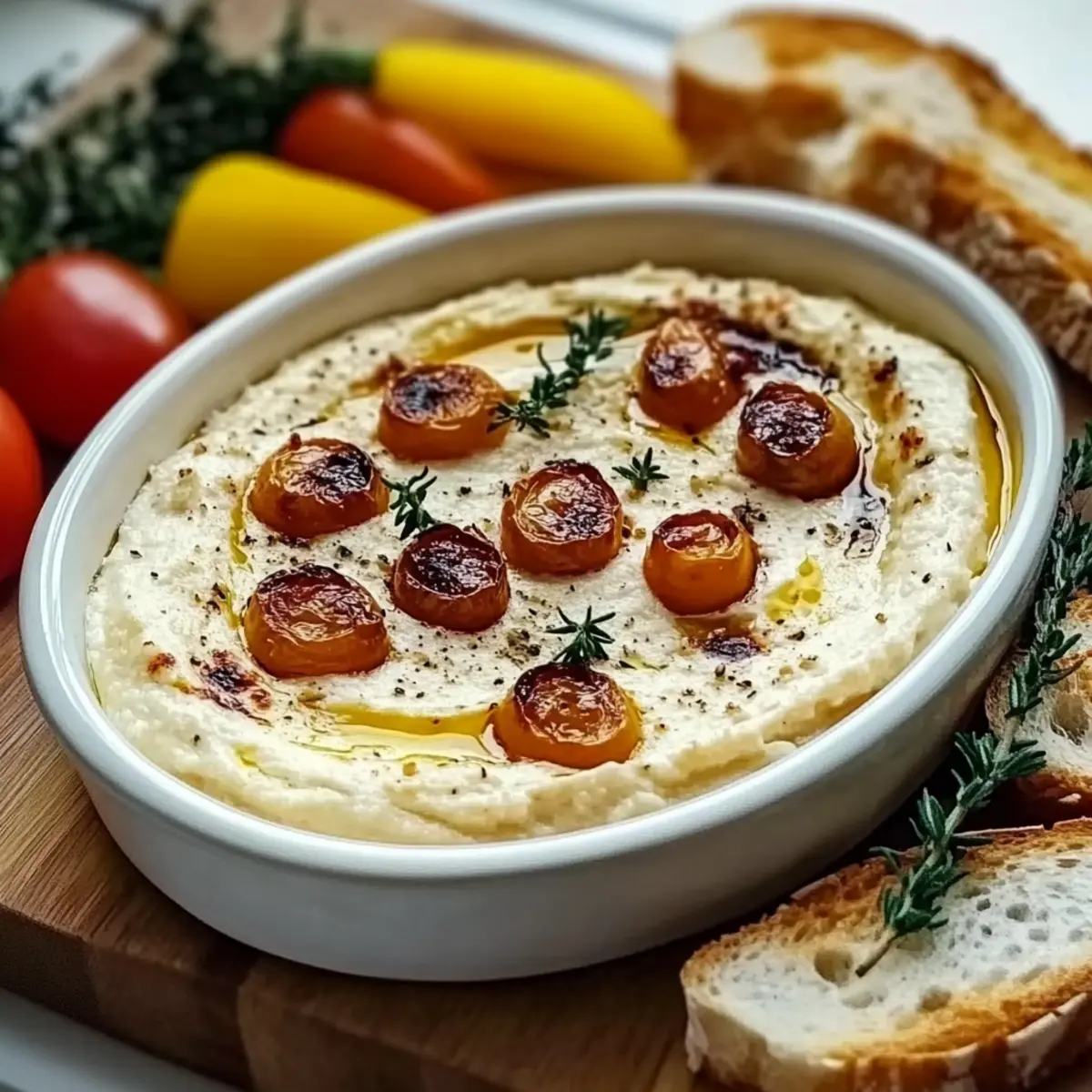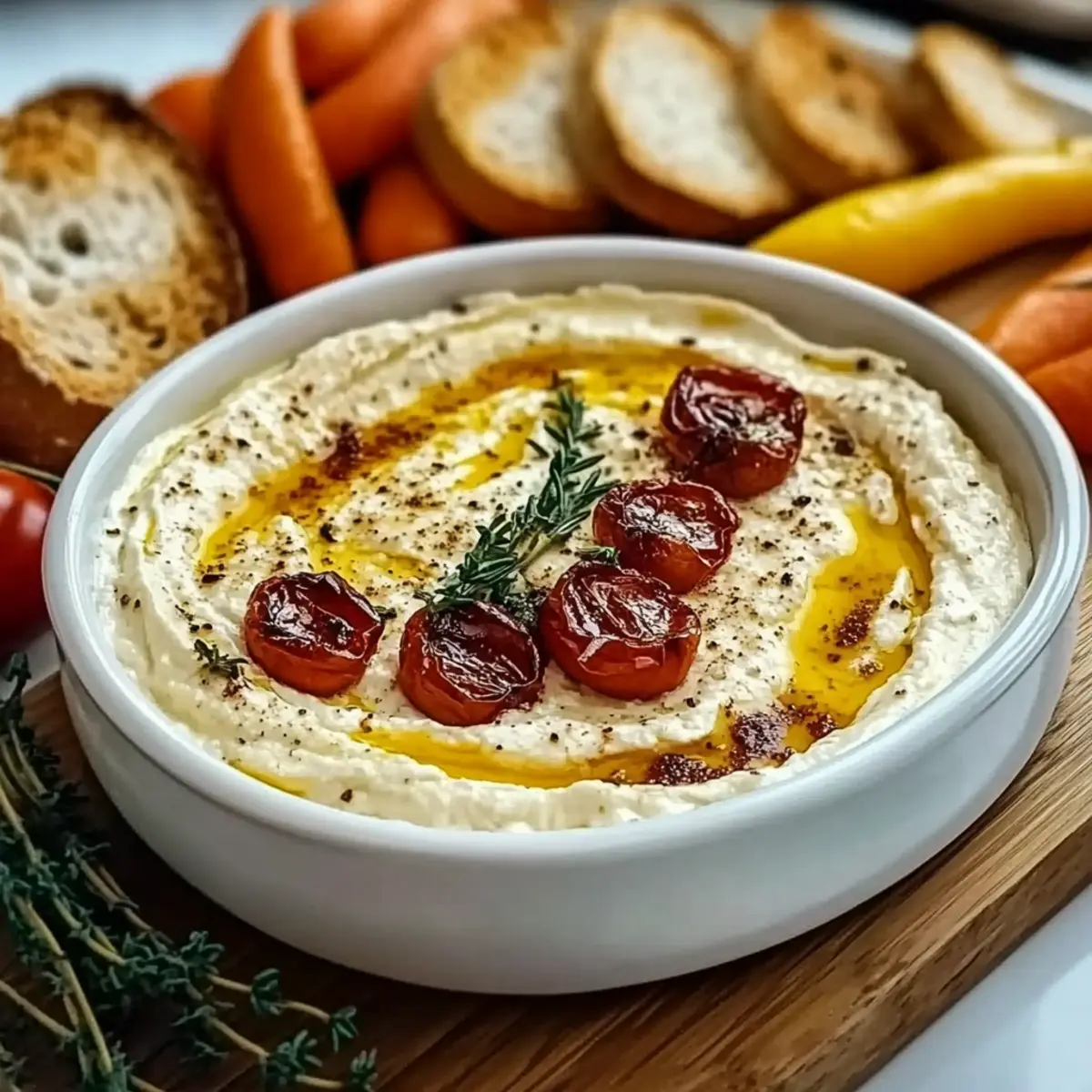 - Transfer the dip to a serving dish, garnish with thyme or olive oil, and serve warm or at room temperature.