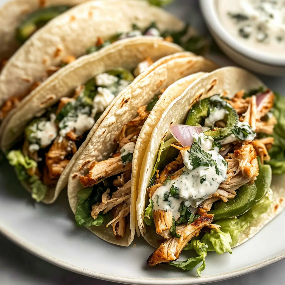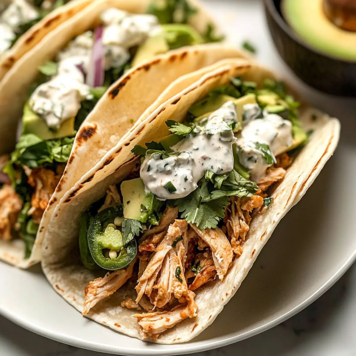 Warm small flour tortillas in a dry skillet for about 30 seconds on each side. To assemble, layer shredded romaine lettuce, the chicken mixture, sliced avocado, and crumbled feta cheese onto each tortilla. Drizzle generously with the creamy chimichurri sauce, and feel free to add any additional toppings you love, making your shredded chicken tacos truly your own. Serve warm!