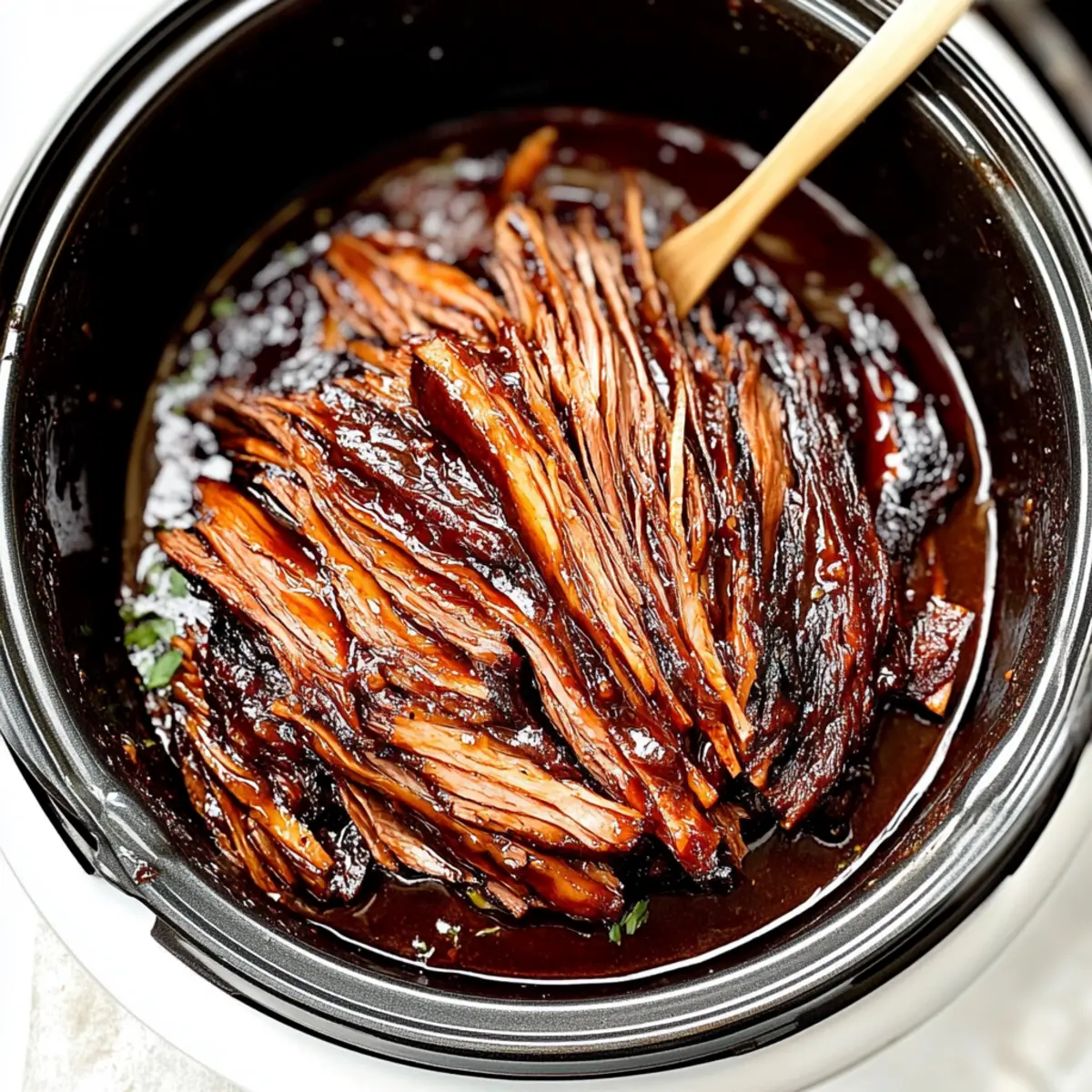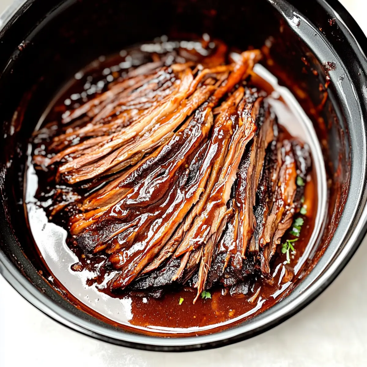 - Return the shredded brisket to the slow cooker and mix with barbecue sauce.