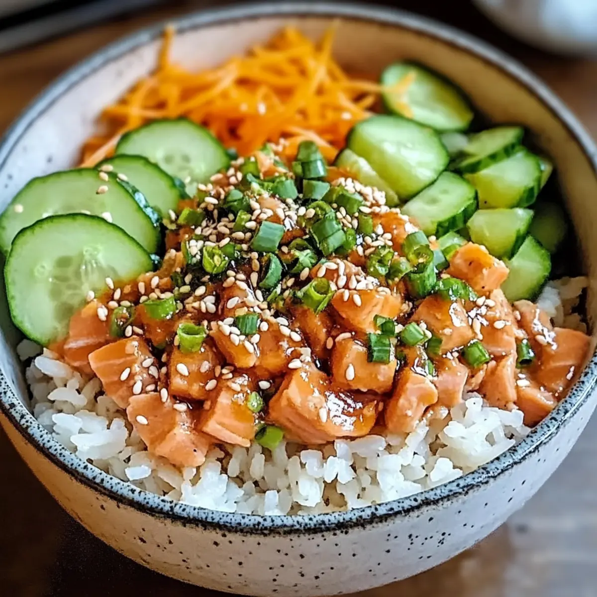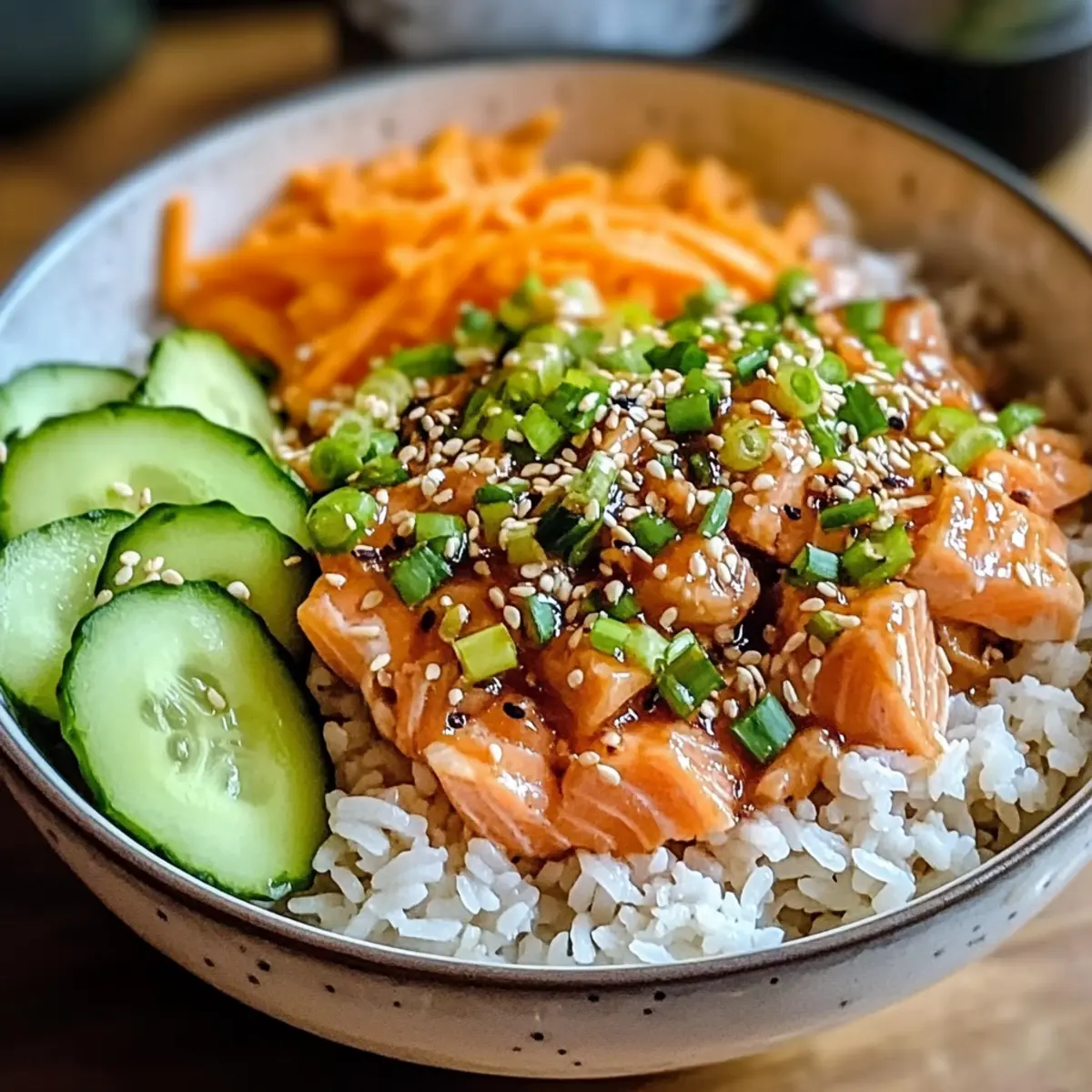 - Divide fluffy rice among serving bowls. Top with the salmon mixture and arrange sliced cucumber, carrots, edamame, and green onions around it.
