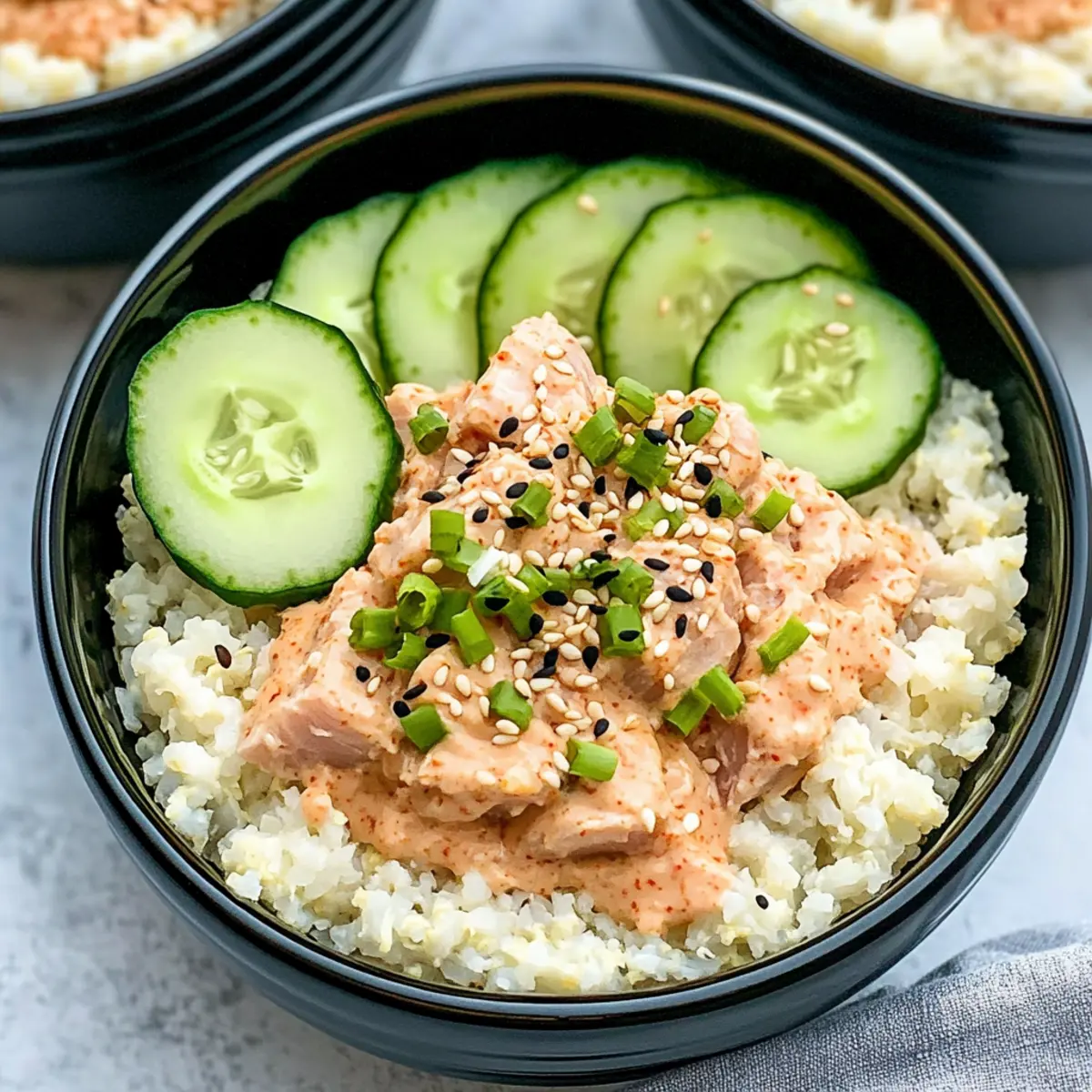 These Spicy Tuna Bowls with Cauliflower Rice are a fantastic solution for meal prep enthusiasts looking to save time! You can prepare the cauliflower rice and the spicy tuna mixture up to 24 hours in advance. Simply steam the cauliflower rice and mix it with seasoned rice vinegar, then store it in an airtight container in the fridge. For the tuna, combine the mayonnaise, sriracha, and sesame oil, then gently fold in the drained tuna and refrigerate it in another container. To serve, just divide the cauliflower rice into bowls, top with the prepared tuna, and garnish with cucumber and sesame seeds. This way, you’ll have a quick and delicious meal ready to go on busy weeknights!