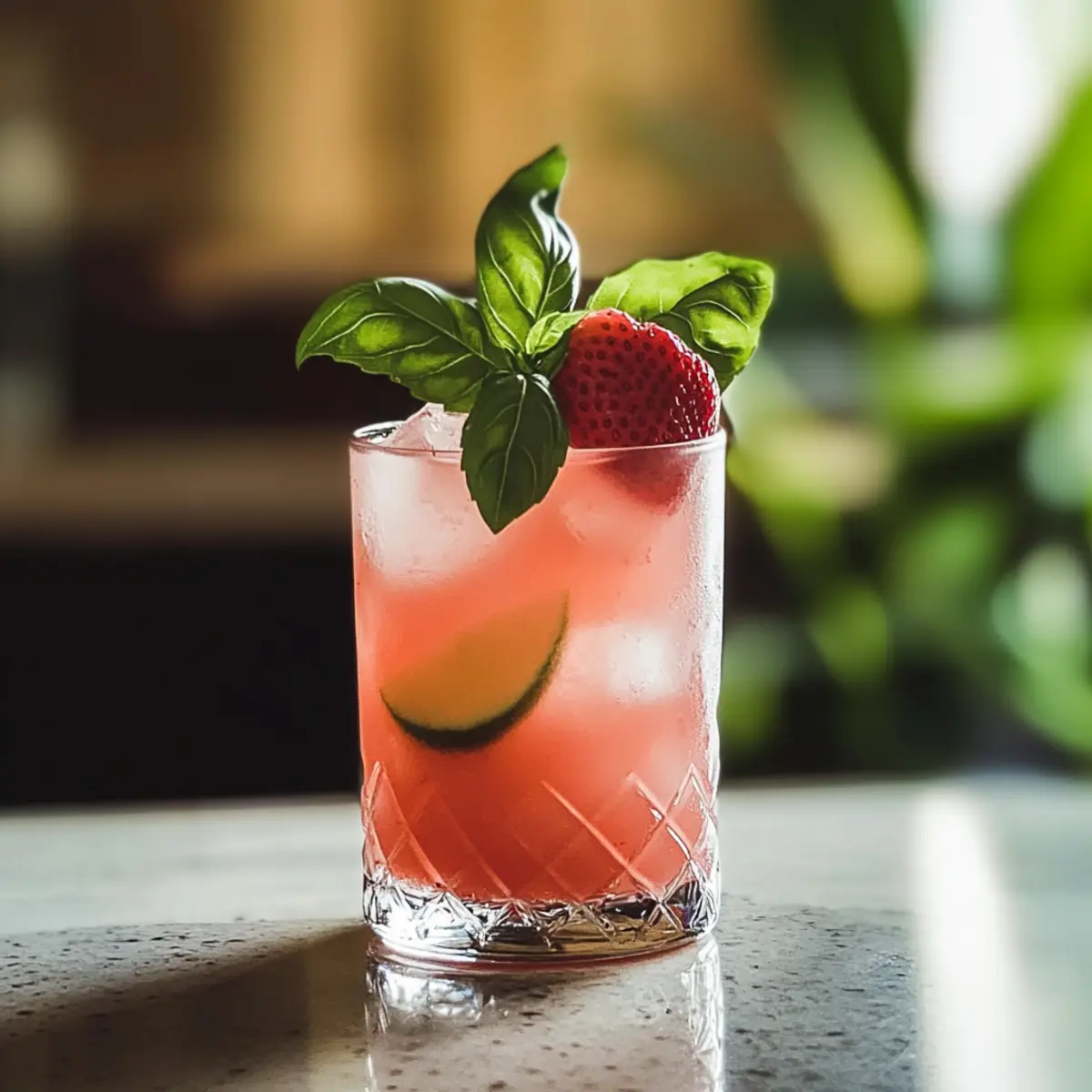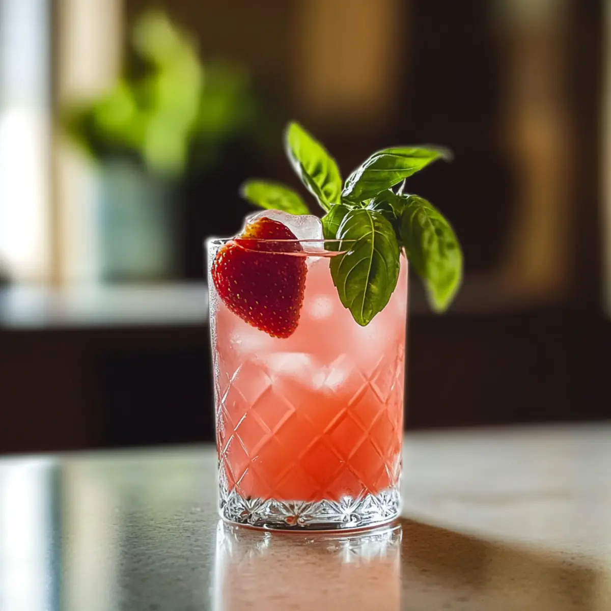 - In a sturdy glass, combine fresh strawberries and basil leaves. Muddle gently for 30 seconds.