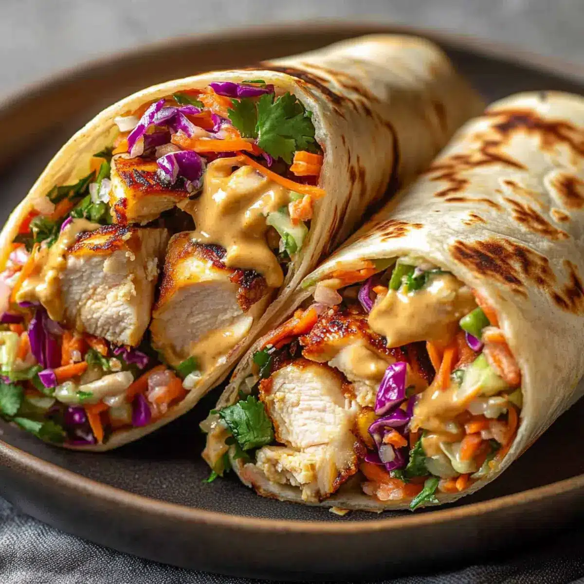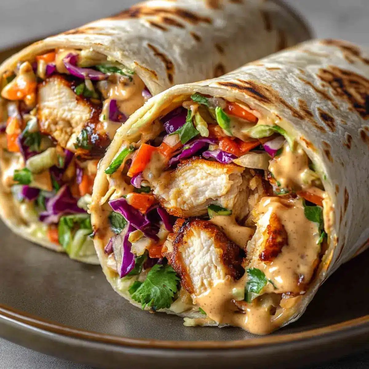 Warm tortillas or flatbreads in a pan or microwave. Spread a generous layer of the peanut sauce on each tortilla, then layer with sliced chicken and a heaping portion of the crunchy Asian slaw. Drizzle more peanut sauce on top if desired, then fold the tortillas tightly around the filling, securing all the delicious components in your Thai Chicken Wrap. Slice in half to serve.