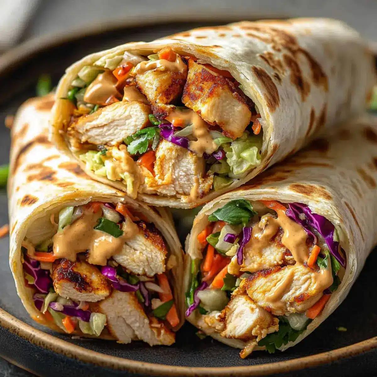 - Assemble the Wraps: Warm tortillas, spread peanut sauce, layer with sliced chicken and Asian slaw, fold, and slice in half to serve.