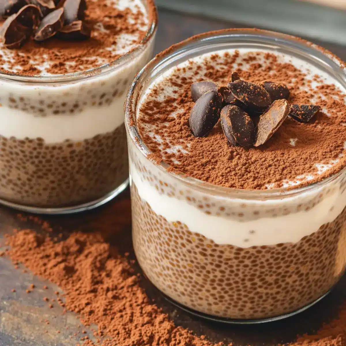 - Add a layer of the yogurt topping over each jar of chia pudding and sprinkle cocoa powder on top.