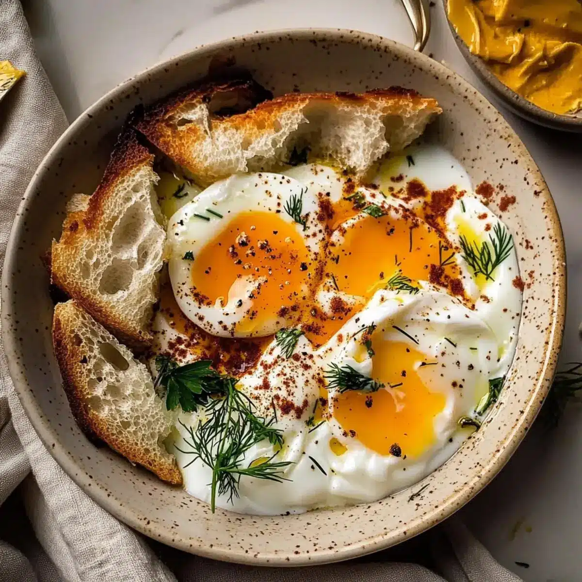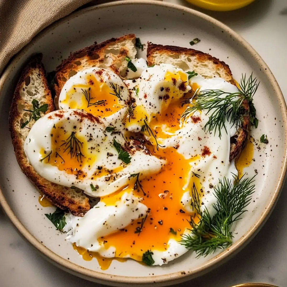 Spread a generous layer of the creamy herbed yogurt across the bottom of shallow bowls. Gently place two poached eggs on top of each serving, creating a cozy nest for the eggs. Drizzle the spiced butter sauce generously over the eggs, allowing it to cascade down. To finish, sprinkle fresh dill or mint and a pinch of flaky sea salt for an added touch of flavor. Serve immediately, alongside warm bread for a delightful dipping experience!