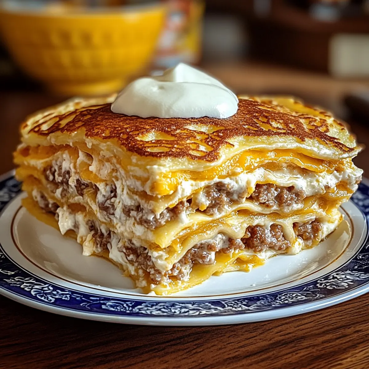 Comforting, Cozy Meal: The Ultimate Breakfast Lasagna wraps you in fluffy pancakes and savory sausage, making every bite a delight.