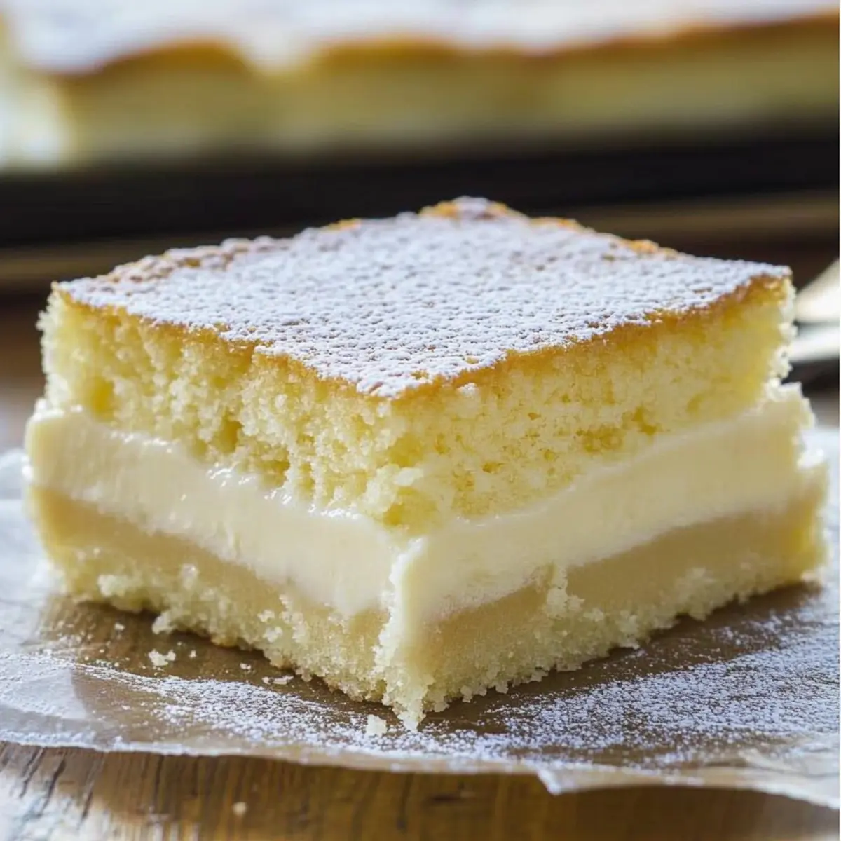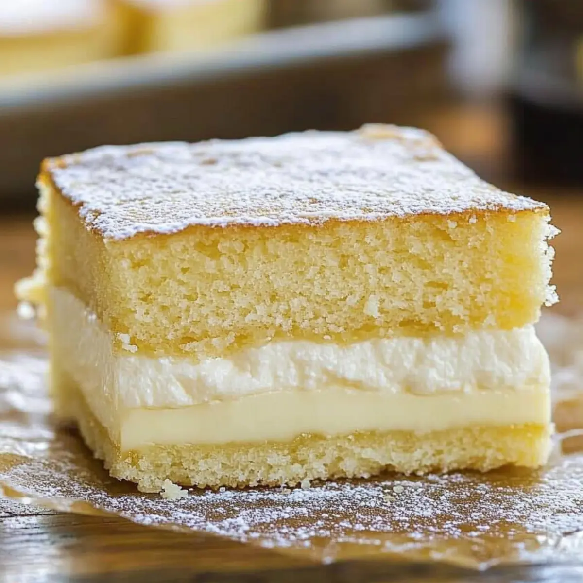 Once baked, carefully remove the dish from the oven and allow your Vanilla Magic Custard Cake to cool completely. For the best texture, refrigerate it for a couple of hours, then slice it into squares to serve. The custard layers will reveal themselves as you cut, boasting a creamy center that pairs beautifully with a dusting of powdered sugar.
