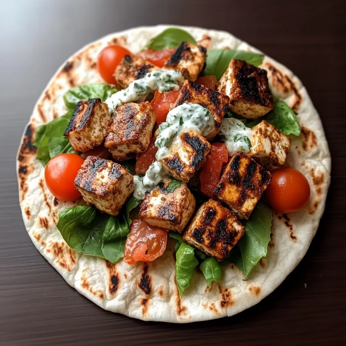 - Warm the pita bread on the skillet or grill. Assemble by placing crispy tofu inside the warm pita and adding a generous dollop of Vegan Tzatziki.